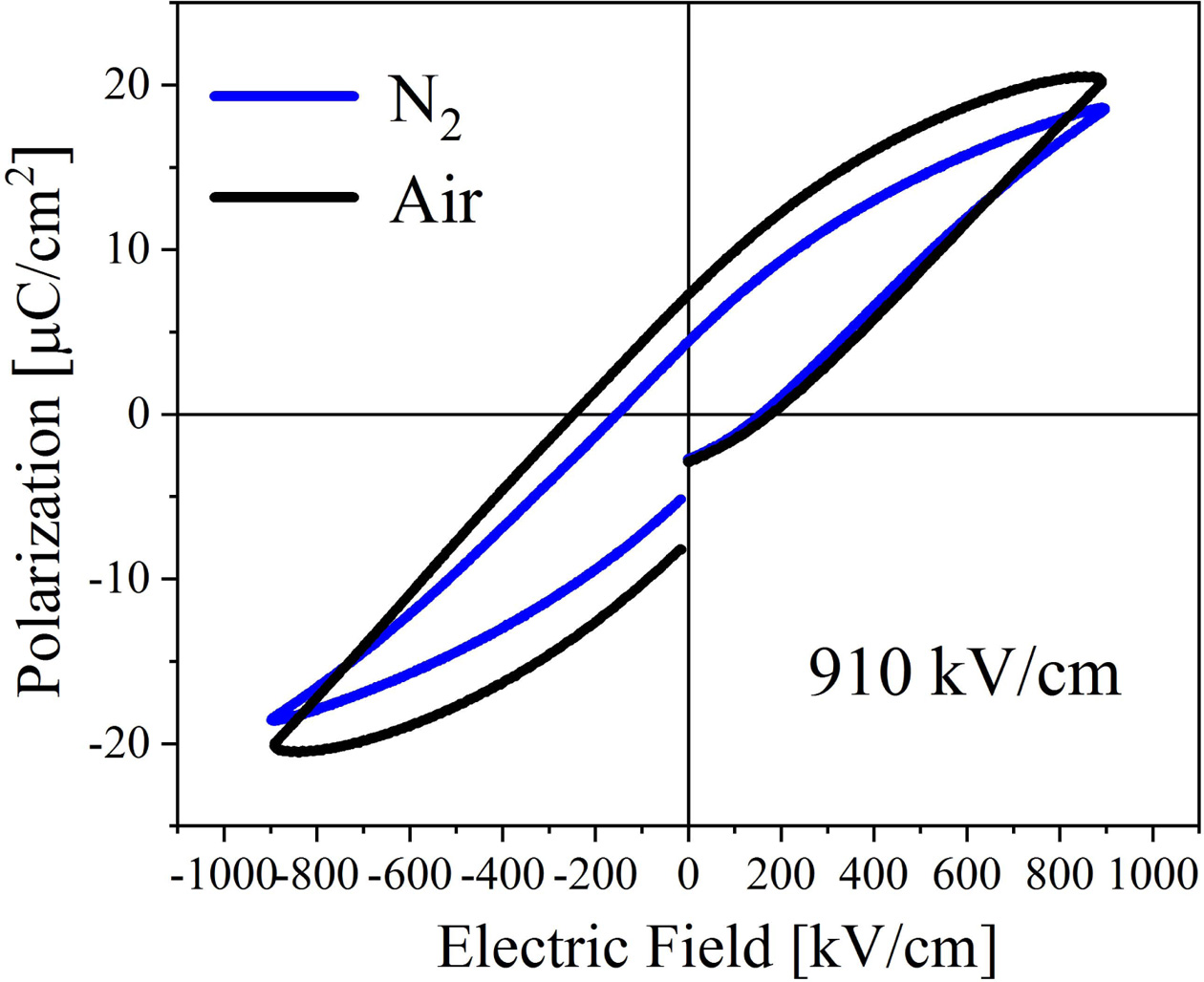 Fig. 6 shows the ferroelectric performance of the BIT films prepared in different atmospheres, and the test electric field is 910 kV/cm. Annealed in nitrogen and air, the remanent polarization strength (2Pr) of the samples are 9.6 μC/cm2 and 15 μC/cm2, and the coercive field strengths are 309.8 kV/cm and 424.5 kV/cm, respectively. Interestingly, the air-annealed samples have higher remanent polarization strength and stronger coercive field compared with annealing in nitrogen. It is evident that the ferroelectric performance is affected by the competitive mechanism of various factors. The larger remanent polarization may be due to: (1) The larger lattice distortion of the air-annealed samples increases the degree of polarization [26]. (2) There are more free V''Bi in the air-annealed samples, which could promote the ferroelectric domain migration and improve the ferroelectric performance [6]. (3) There are few VO•• in the air-annealed samples. The accumulation of VO•• in the domain boundaries could cause domain pinning, thus hindering the polarization switching. Additionally, the stronger coercive field may be due to: (1) The average grain boundary area (the area where the domain walls may be pinned by the defect dipoles) of the small grains in the air-annealed samples is larger than the large grains in the nitrogen-annealed samples, so the probability of the domain walls of the air-annealed samples to be pinned is higher [37]. (2) It may be related to the different amplitude of polarization, the way of domain growth, and the concentration ratio between the domain walls and grain boundaries in the films [38].