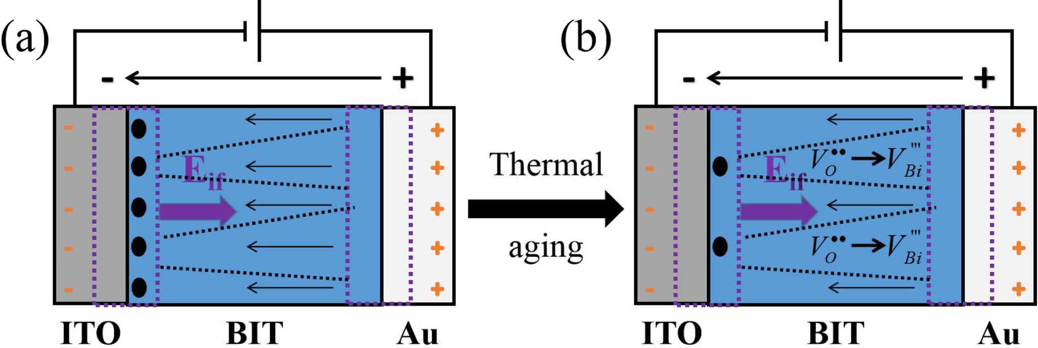 Where +EC (-EC) is the positive (negative) coercive field strength. The Ei of the nitrogen- and air-annealed samples are calculated to be 2.0 kV/cm and -34.72 kV/cm, respectively. The hysteresis loop of the air-annealed BIT films shows an obvious negative voltage deviation, indicating that an internal electric field Eif pointing to the top electrode is created by the electron capture mechanism at the bottom electrode interface [28, 39]. The work function of Au is 5.1 eV and that of ITO is 4.85 eV, so two schottky barriers with different barrier heights are formed in ITO/BIT and BIT/Au interfaces [40]. A net built-in electric field Eif, from the higher barrier to the lower barrier, could be generated by the asymmetric schottky barriers between the two interfaces in the BIT film [34], as shown in Fig. 7(a). Therefore, more VO•• could accumulate in the bottom ITO/BIT interface than in the top BIT/Au interface, resulting in the generation of more (V''Bi) - (VO••) and forming a defect layer [41, 42].