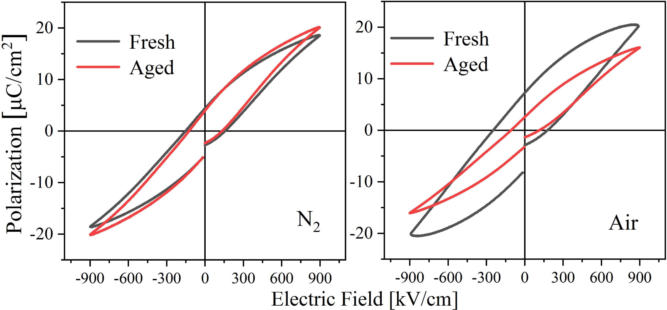 Since the properties of the prepared BIT films are relatively stable, they are put into an oven at 60 oC for thermal aging treatment for 60 h in order to obtain the aged samples as soon as possible for research. The comparison of the hysteresis loops of the samples before and after aging is shown in Fig. 8. After aging treatment, the 2Pr of the nitrogen-annealed sample decreased by 5.6%, while the 2Pr of the air-annealed sample decreased by 62.3%. It can be seen that the air-annealed aging sample presents significant degradation of the ferroelectric properties. It is generally assumed that the aging of the ferroelectric films results from the gradual fixation of the local domain structures and domain walls over time, which prevents the domain structures from switching with the applied electric field [48]. After thermal aging treatment, the VO•• in the BIT films that are easy to move will not only transition over a short distance, but also lead to a long distance migra- tion. The short-distance VO•• transition rearranges or reorientates the defect dipoles (V''Bi) - (VO••) in the volume and stabilizes the domain structure, a mechanism known as the volume effect [49]. However, the long-distance VO•• migration to the interfaces such as grain boundaries can realize the pinning of the domain walls to prevent the switching of domain (grain boundary effect) [50]. Therefore, the aging of the air-annealed sample with larger average grain boundary area and more (V''Bi) - (VO••) dipoles is more serious. In addition, it is found that the imprinting effect of the air-annealed aging sample disappears, because the captured charge tended to relax in the thermal aging process [48].
