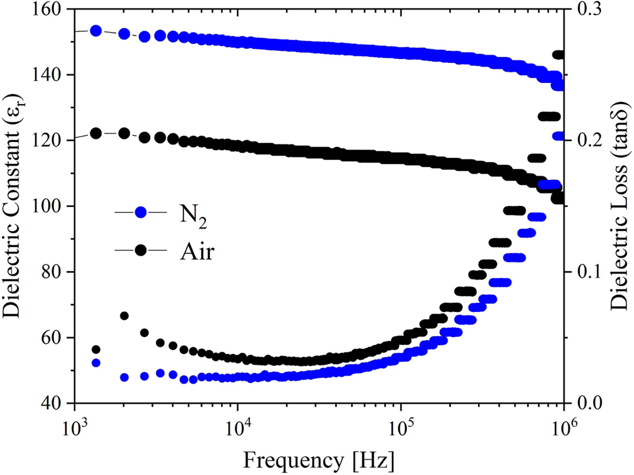 As shown in Fig. 9, the dielectric constant (εr) and dielectric loss (tanδ) of the BIT ferroelectric films vary with the test frequency. The εr of the two samples have good frequency stability in the frequency range of 103~106 Hz. The dielectric losses increase with the frequency increase, which can be mainly derived from that the tanδ is dominated by the leakage current at low frequency and the inertia of the electric dipoles at frequency higher than 104 Hz [28]. At 104 Hz, the εr of the samples annealed in air and nitrogen are 118.3 and 149.7, respectively, and the dielectric losses are 0.03 and 0.02, respectively. The good dielectric performance of the nitrogen-annealed sample is mainly due to the larger grain size, better crystallinity and fewer structural defects (micropores) [6, 51]. It is speculated that the larger porosity on the surface of the air-annealed samples affects the interface polarization, resulting in the decrease of dielectric constant [38].