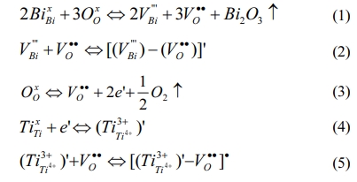Previous research results show that the change of defect state is one of the main factors affecting the structure and various electrical performances of ferroelectric films [13-15]. Additionally, even a small number of surface defects have great potential in adjusting band structure and carrier concentration [16]. The formation of the possible point defects and defect dipoles in the BIT film are summarized. Firstly, the bismuth vacancies (V''Bi) are formed due to the inevitable bismuth volatilization in the process of film preparation, and the oxygen vacancies (VO••) are generated nearby to maintain charge neutrality [Eq. (1)]. And the defect dipoles (V''Bi) - (VO••) may be formed [Eq. (2)]. Secondly, previous research [13, 17] shows that annealing in nitrogen promoted the oxygen atom overflow, which resulted in more oxygen vacancies in ferroelectric film materials [Eq. (3)]. In addition, if the Ti atoms in the lattice capture the electrons presented in Eq. (3), the valence of Ti atoms will be changed, so the negatively charged ions (Ti3+Ti4+) are formed [Eq.(4)]. The corresponding defect dipoles (Ti3+Ti4+)' - VO•• also be formed by (Ti3+Ti4+)' and VO•• [Eq.(5)].