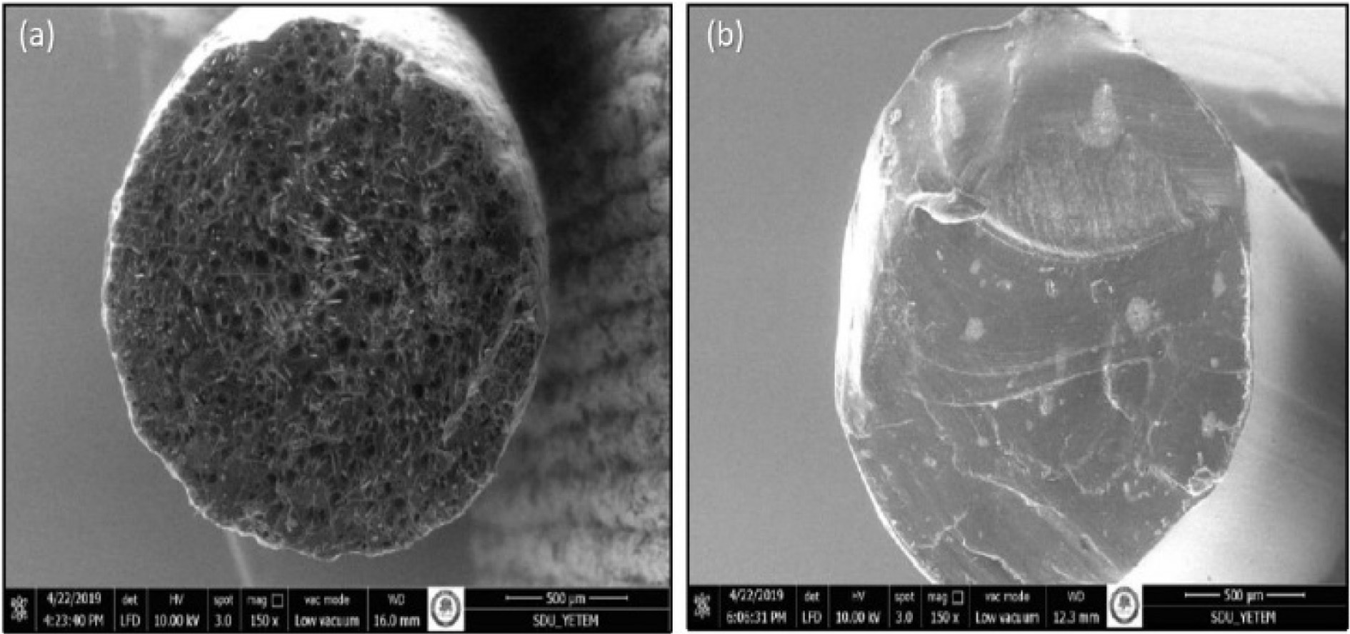 Fig. 2 Microstructures of (a) ABS and (b) PLA filaments. |