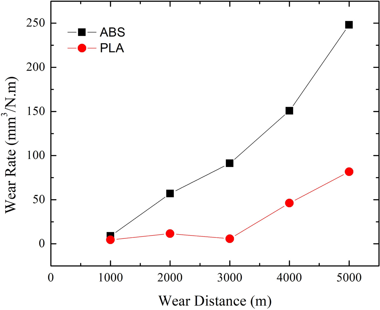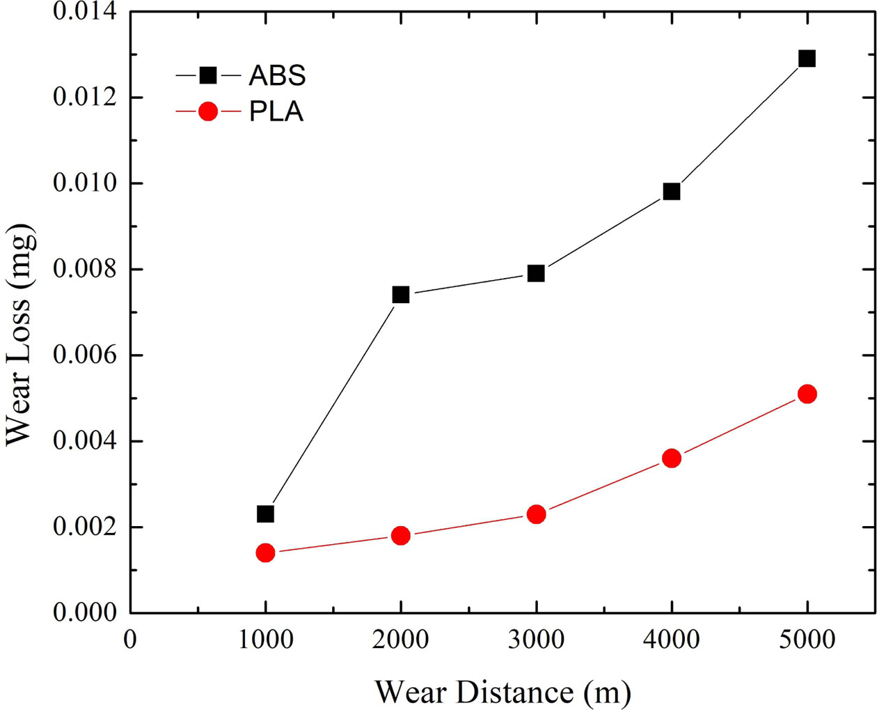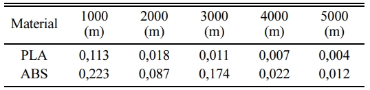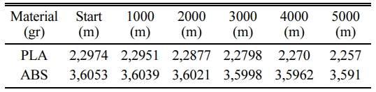 When we look at the wear characteristics of PLA and ABS specimens, on 5000 m test results shows that, PLA specimens have better wear resistance to 0.0051 kg weight loss in 5000 m than 0.0129 kg ABS material. The weight losses of wear of the produced PLA and ABS samples are shown in Fig. 6.