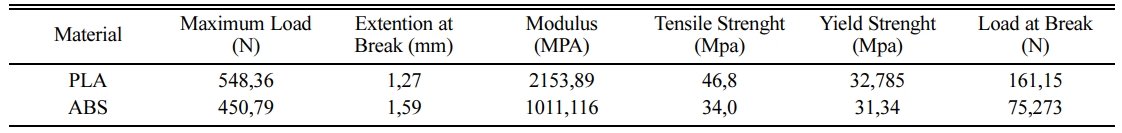 The results obtained from the different tests show differences between different plastic materials. As can be seen in Table 1. All materials have produced to same parameters but PLA has showed the higher tensile strength and tensile modulus with 46.8 MPa and 2153,59 MPa than ABS 34 MPA tensile and 1011,11 MPa modulus. Practical findings in the process showed that; The combination of %100 infill density and 0o raster orientation showed the highest tensile strength and elastic modulus with a value for PLA and for ABS respectively.