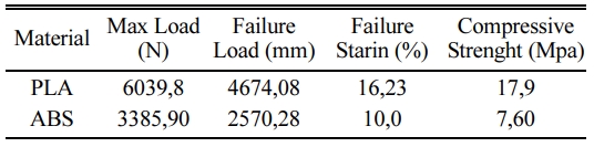 When we look at the compressive test PLA shows higher compression strength again then ABS material. With these tensile results, it can be seen that these plastics shows different characteristics but PLA parts can be useful in functional applications [19]. Mechanical test results of the produced PLA and ABS samples are shown in Table 1, 2, 3.
