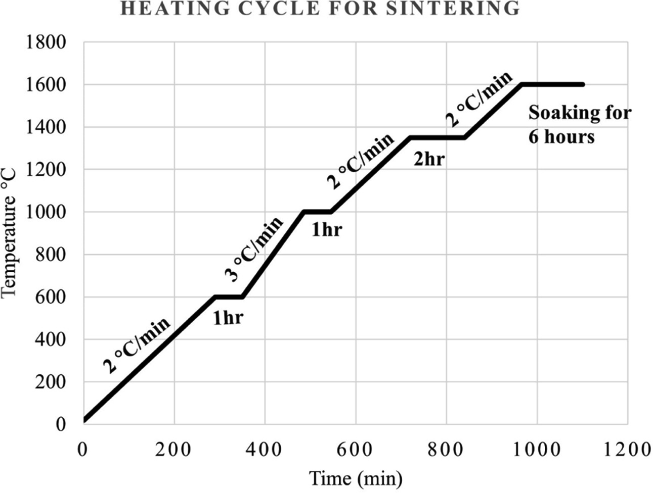Slip was made using Alumina powder as raw material with distilled water/ethanol, binder and different additives were put in a cylindrical shell that contains manganese steel balls. In the light of the work done by researcher’s sodium carbonate was used as a binder from 3 to 5%. It was made to rotate at 68 rpm for homogenized mixing of the composition. This process was kept continued from 6 to 30 h. Three compositions were made as given in table 1, that were named as; sample containing alumina is named as Simple, sample containing ZrO2 named as (ZTA) and samples incor- porated with SiC is named as (SiCA). Slip made was then poured to plaster of Paris mold and was kept in air for 24 h for partial drying. The slip was then removed in a box upon removal of the moisture and is then processed further. After complete drying of the slip product it was then pressed to desire Shape/geometry. Pressing of ceramic powder was done using hydraulic press at 2500 psi. The pressed product has the thickness in the range of 10 mm. Green density was measured which was found quite relative to the desired one. The samples were then loaded into a vacuum sintering furnace having argon atmosphere and were sintered at 1600 oC with prescribed heating rate. The sample were given soaking time of about 6 h. The sintering cycle used was as fallows in Fig. 2.