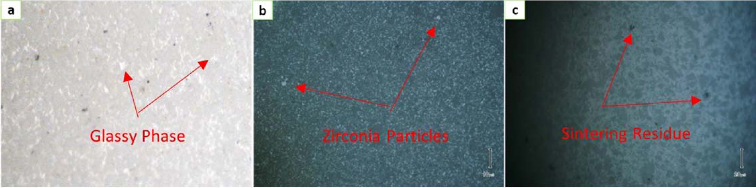 Micrographs of Polished surfaces of the samples are shown in Fig. 2. Fig. 2(a) shows that it contains more a-Al2O3 phase also the residue of sintering additives can be clearly seen in Fig. 2(b) white particles are ZrO2 grains which are smaller and widely distributed. It shows that the ZrO2 addition has significant effect on grain growth of ZTA. Also, as ZrO2 act as the elongated second phase particle in ZTA so it is located at grain boundaries for crack arrest. White particles in the figure are clearly ZrO2. In Fig. 2(c) black particles seems to be the residue of sintering additives. But there is indication from the literature that it may act as the second phase particle to tailor the grain size and to improve densification, while the blackish region shows the porosity or sintering additives.