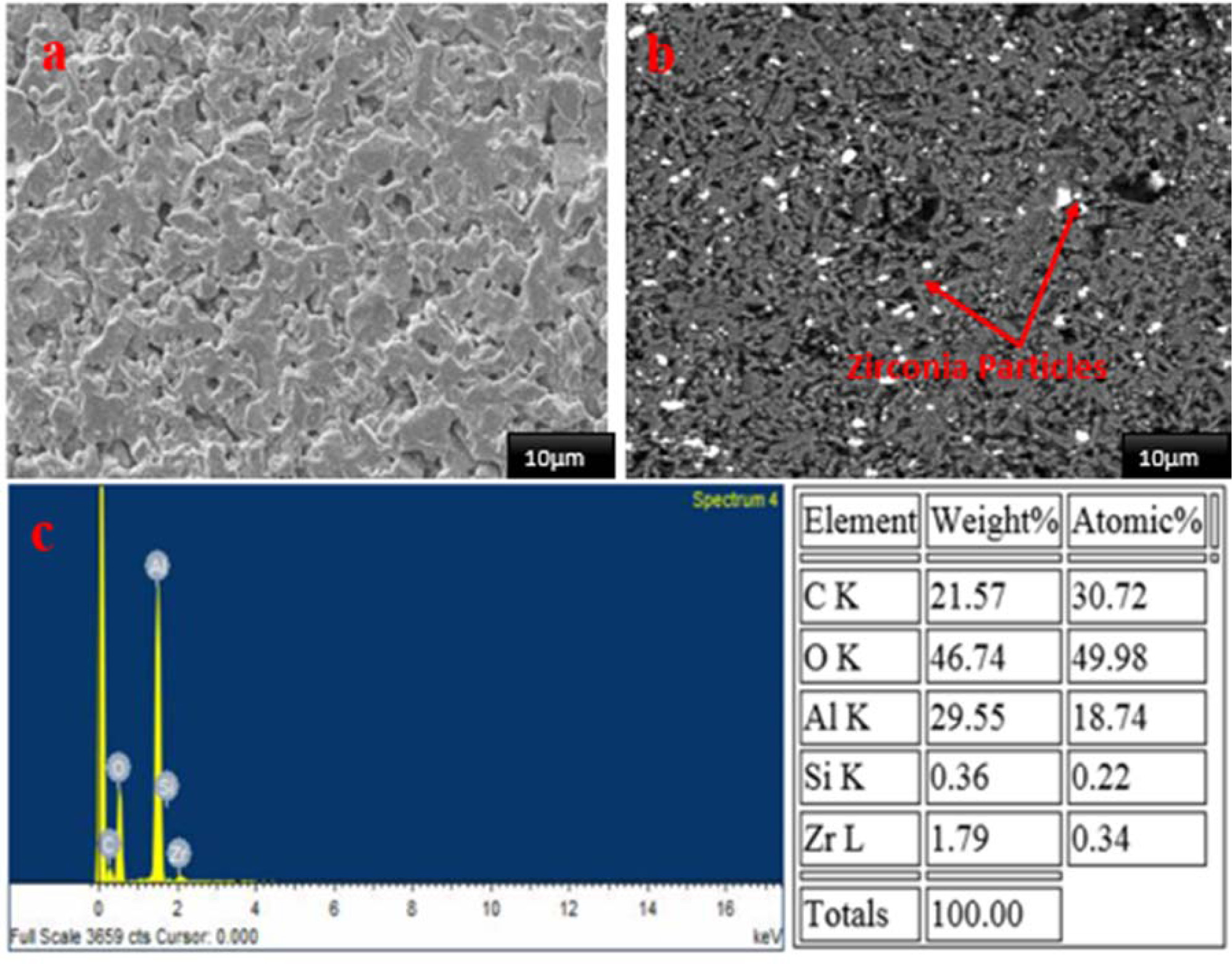 SEM-EDX analysis of samples are investigated by using SEM for compositional Analysis. EDX analysis of the samples confirms the presence of ZrO2 and SiC particles respectively as shown in Fig. 3(c)-5(c). The high percentage of carbon is due to the carbon tape and graphite electrode which was used for sputtering of samples so the electrons may pass through. The little percentage of oxygen is due to the no 100 percent inert atmosphere because nitrogen gas is used to create the inert atmosphere and that is not exactly to create inert atmosphere like noble gases. Fig. 3(c) showing the elemental composition of simple alumina samples. This analysis confirms the presence of alumina as the matrix phase as it has the second maximum percentage after oxygen. There is also the little amount of sodium (Na) which may be because of the deflocculating agent or from binder residue. The high percentage of carbon is mainly because of the sputtering media.