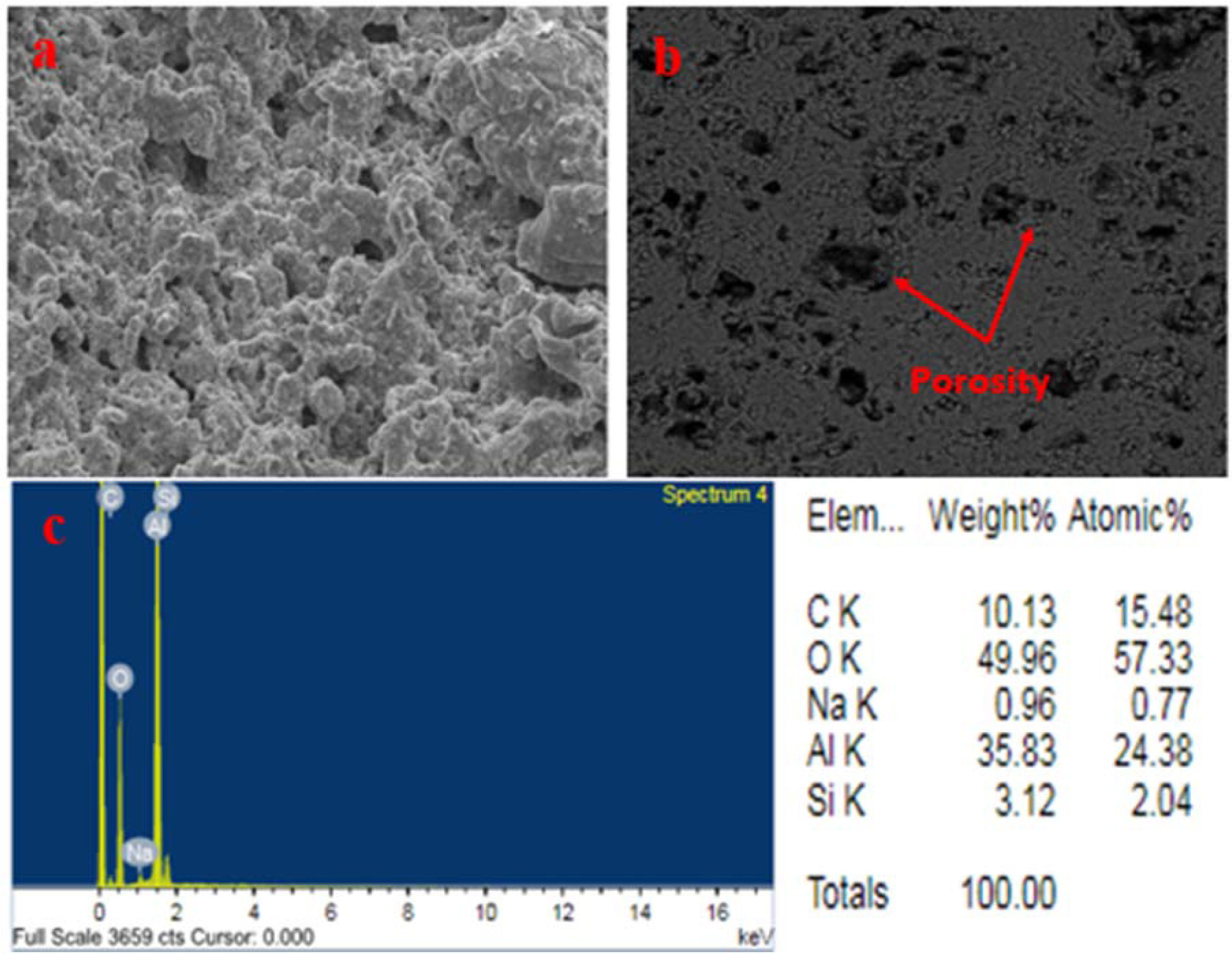 Fig. 5 SEM images and EDS Spectra shows the chemical composition of base alumina (a) SE (b) BSE (c) EDS analysis confirming