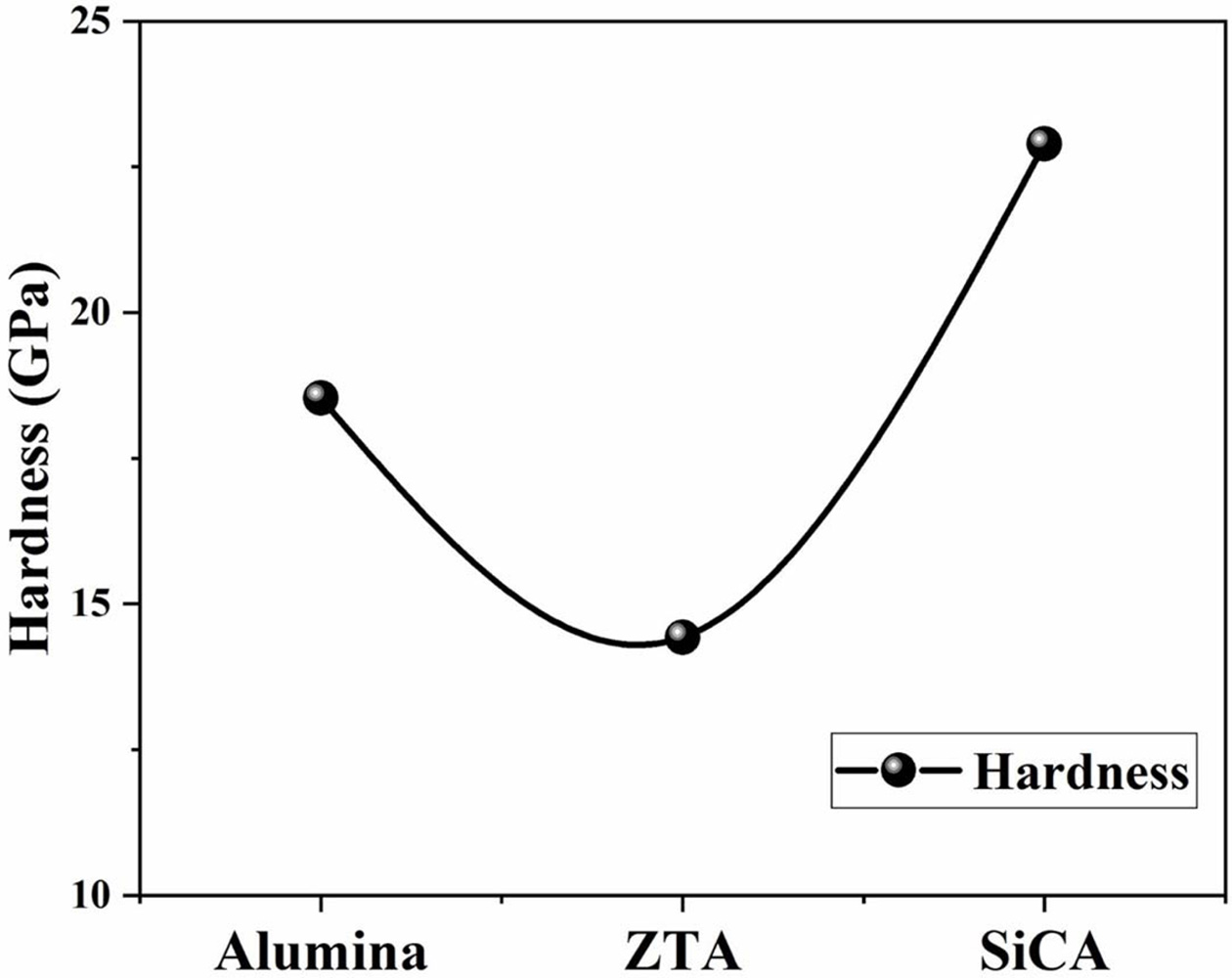 Hardness was calculated at 980N. Five measurements were made at a distance of 3 mm using Eq. (6). Table 3 demonstrated the Vicker hardness value at given applied load. From the Table 3 it can be seen that SiCA shows the highest value of hardness at applied load because of coarser grain size. The main reason for this load is as we increase indentation load the hardness value decreases as evident by literature [5, 37]. Both ZTA and SiCA showed the same trend. This is due to indentation size effect (ISE) which results in incomplete and reversible deformation at low load. SiCA displayed the cracking which is due to the porosity value that made the indent too invisible at low loads.
