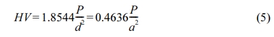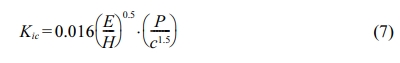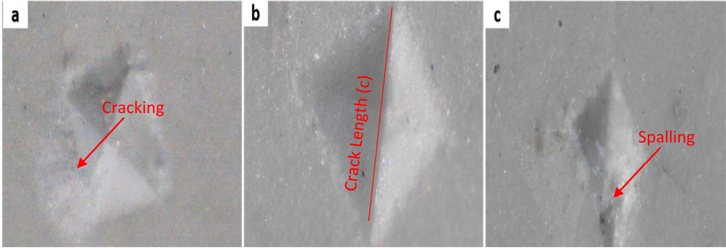 Cracks from the Vickers indentations were used to measure the fracture toughness by Anstis method. Fracture toughness was estimated by Vickers indentation method and is termed as Kc or Kic fracture toughness can be calculated in N/m1.5 using Anstis method given by Eq. (7).