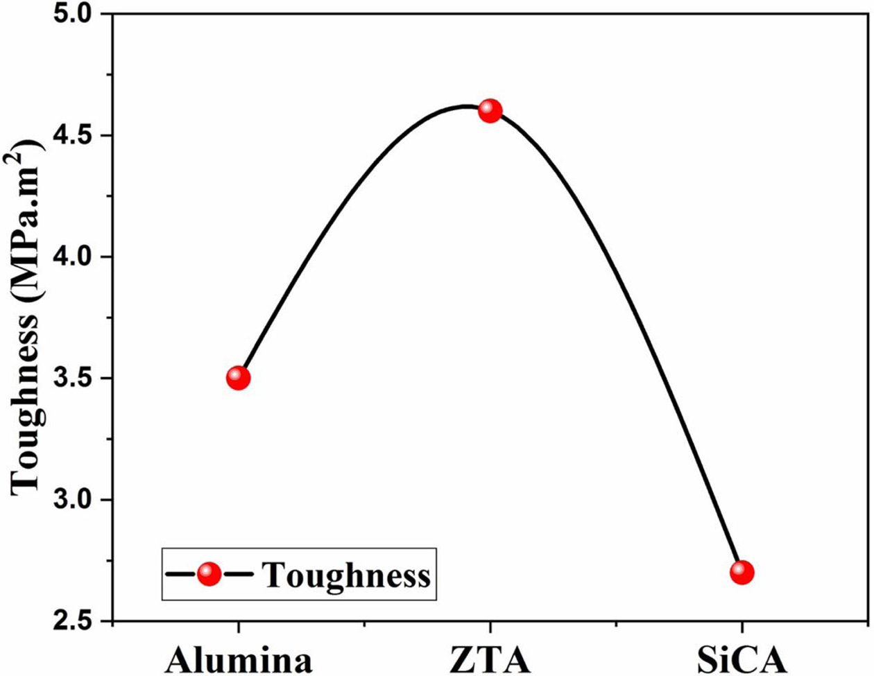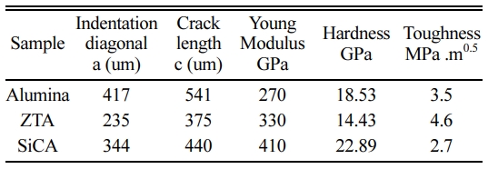 In case of SiCA it showed excessive cracking and spalling. The crack length c measured is the length from midpoint to tip of crack which was measured at average of 3mm. Crack size c and the relative toughness value for samples are given in Table 3. In table modulus of elasticity for samples was taken from the literature which was 270 GPa for simple alumina 330 GPa for ZTA and 410 GPa for SiCA [42].