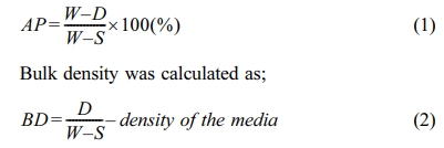 Density was measured by displacement method in which test specimen were suspended in water and the weight known as suspended weight (s) was measured. After this samples were taken out of the water and the dry weight was measured in air. This weight is called soaked weight (w). Bul1k and the apparent density is calculated as [29, 30]