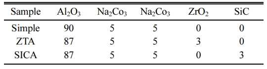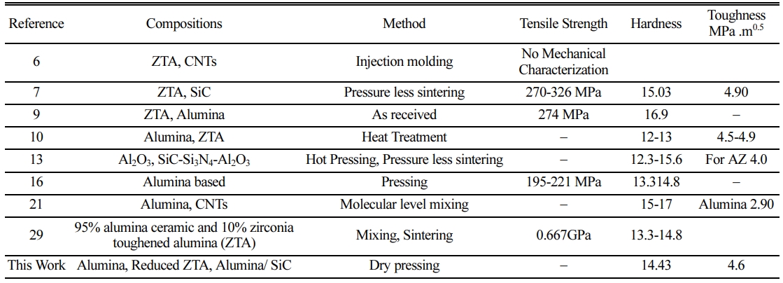 Alumina was chosen as a base material because of its ease of processing. Alumina were doped with tetragonal zirconia and silicon carbide. The slip containing com- position (Table 1) was first dried and were then dry pressed at 110 MPA. The pressed samples were then sintered in argon atmosphere at 1600 oC.