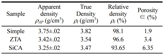 True or theoretical density was measured by rule of mixture using theoretical densities of Al2O3, ZrO2 and SiC are 3.95 g/cm3, 5.71 g/cm3 respectively. Density was also measured using displacement method. Density of ZTA was found to be 4.004 g/cm3 while that of SiCA and simple alumina was 4.1 g/cm3 and 3.99 g/cm3 respectively. In view of the sensitivity of density it was also measured using pycnometry and the values are given in the Table 2. Relative density as calculated using equation 3 while porosity was measured using Eq. (4). It can be seen form the table that pure alumina has the highest density value and the SiC sample has the lowest in comparison while reduced ZTA samples have the intermediate values of density and porosity so it is thought to be best suitable in view of physical and mechanic al properties.