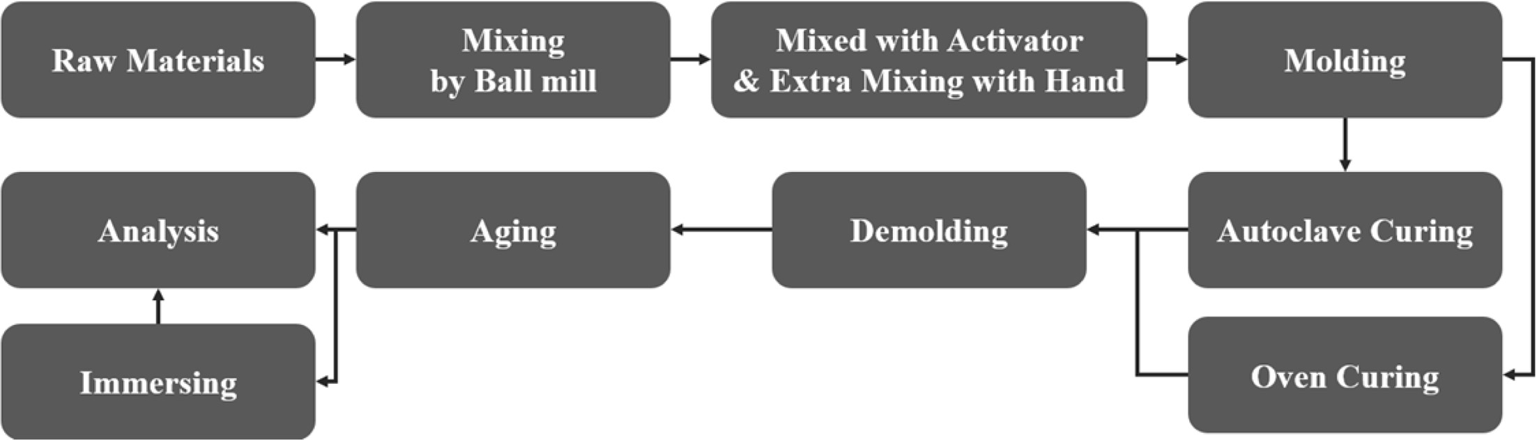 The mixed alkaline activator was used for the geopolymerization and bloating reactions by mixing NaOH pellets (97.0% NaOH; Daejung Co., Korea) and sodium silicates (Na2SiO3 · nH2O; Daejung Co., Korea), known as water glass with a ratio of 1:1. The concen- tration of NaOH was 15 M and the water solid ratio (W/S) was controlled by 0.2. The processed IGCC slags and Si sludge samples were mixed using a ball mill in a dry state for 1 h and then the mixed materials were mixed again with an alkaline activator by hand for more than 5 min prior to molding. The mixed pastes of the geopolymer were molded with a stainless steel mold (5 x 5 x 5 cm3) and then the whole mold was sealed by a polyethylene bag that can be used at the temperature above 150 oC during the curing process for preventing the early evaporation of water during the curing process.