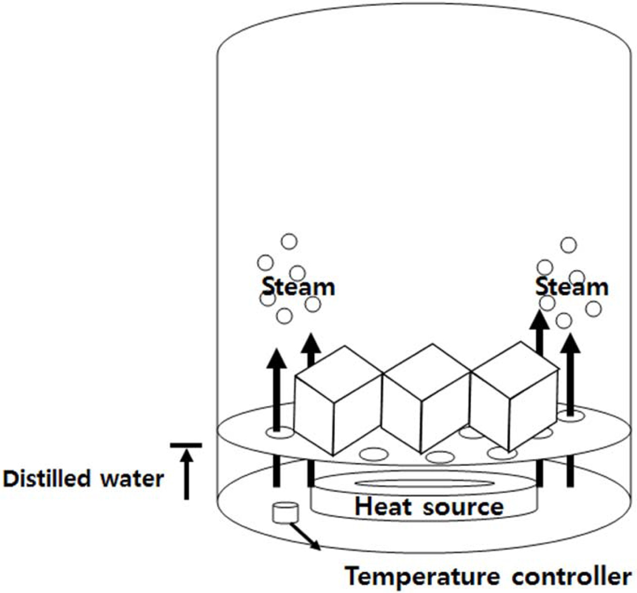 The specimens with the addition of 2.0 wt.% Si sludge were cured in a dry oven and an autoclave after the hand mixing of the geopolymer slurry for more than 5 min to maintain a homogeneous pore size and distribution. An autoclave that can control the chamber pressure through the heating of the water in the bottom of chamber as shown in Fig. 2 was used for the curing process because of the ability to control the water vapor pressure by the adjustment of the heating temperature.