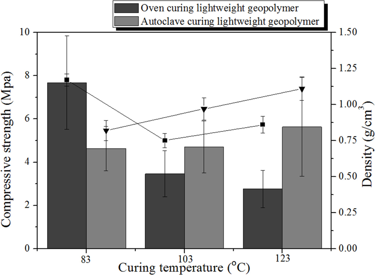 Fig. 3 Comparison of the compressive strength and density of the geopolymer specimens cured in a dry oven and in an autoclave at three different curing temperatures. |