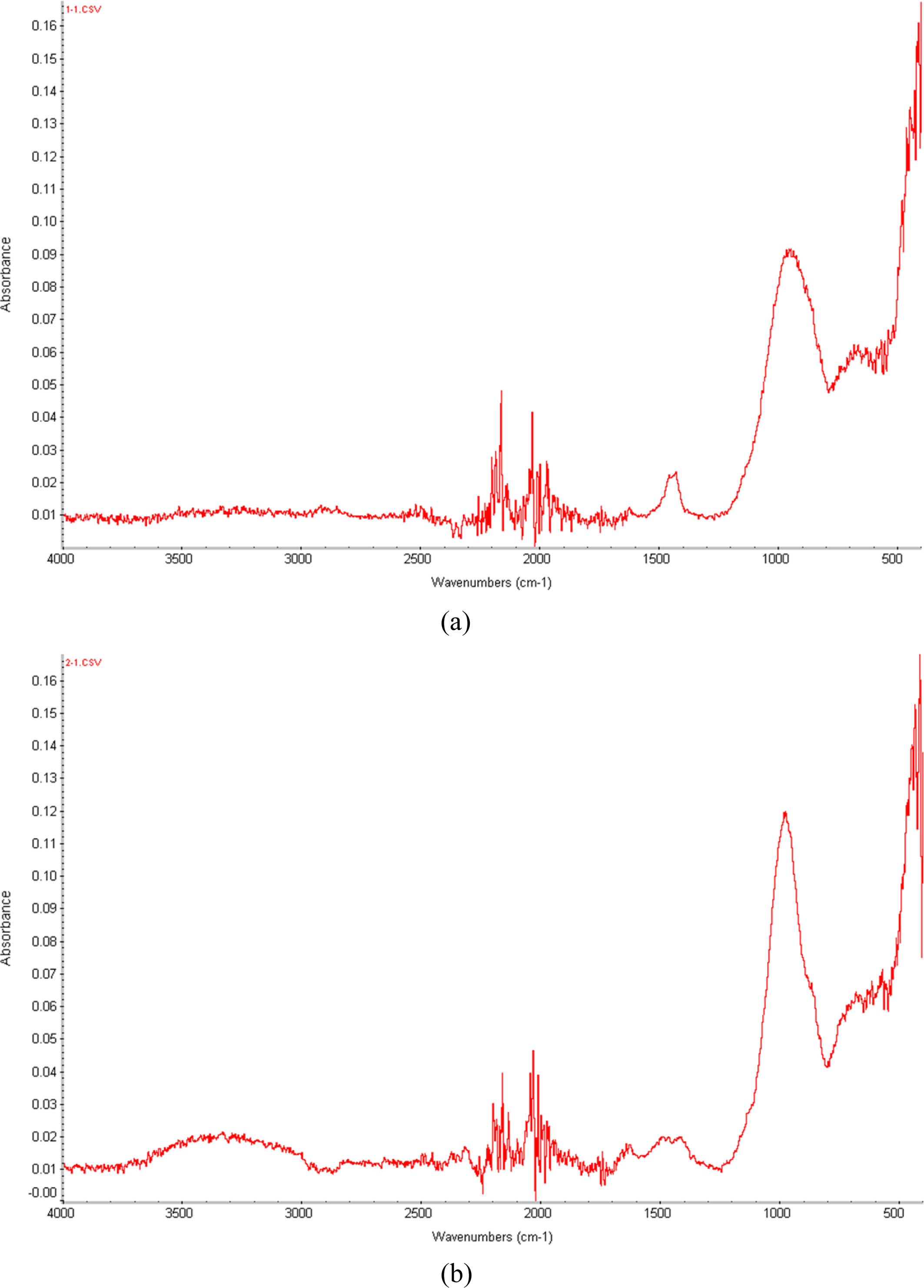 Fig. 4 FT-IR of the specimens cured at 123 oC (a) in a dry oven and (b) in an autoclave. |