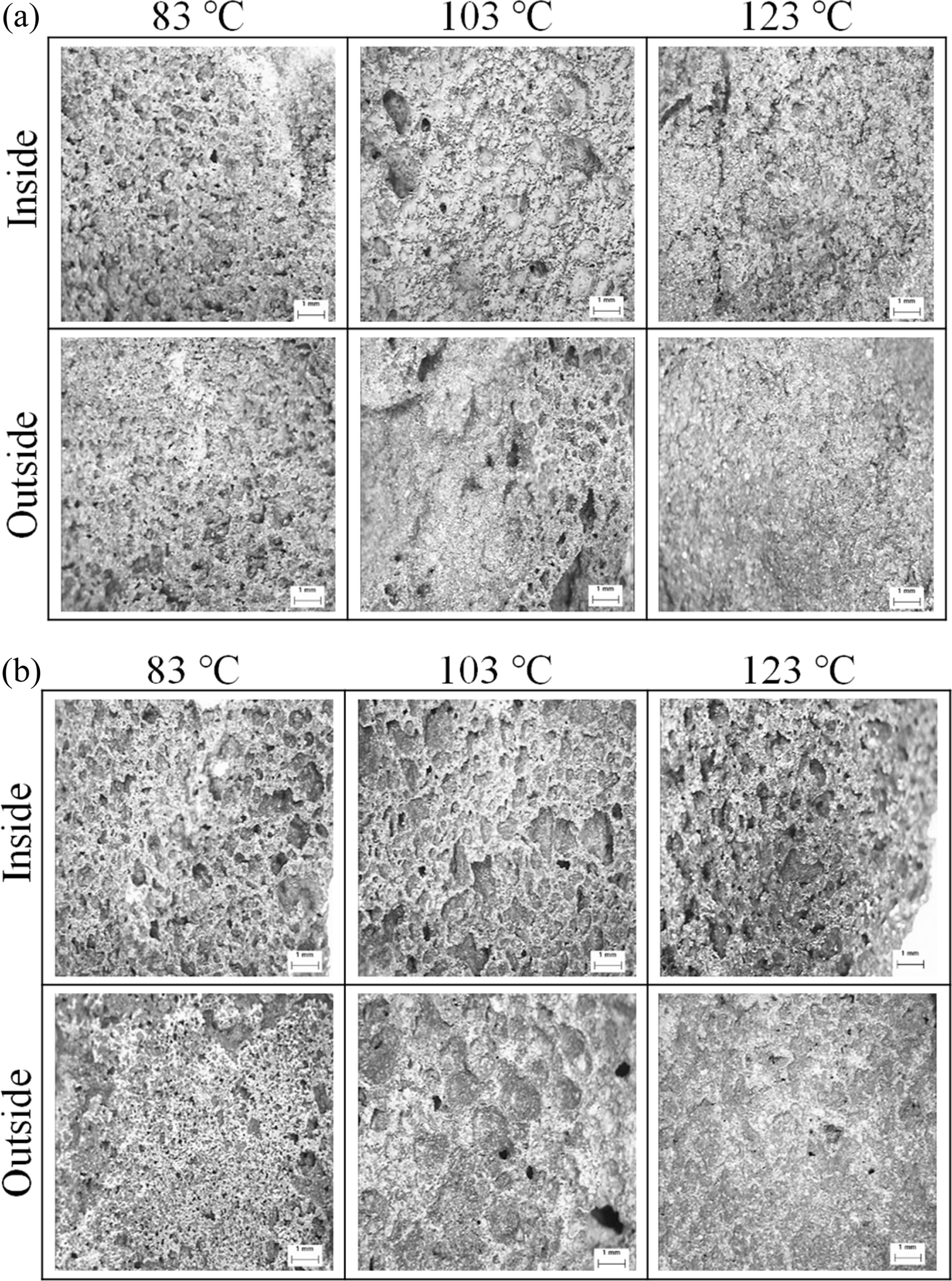 Optical microscopic observation of the outer surfaces and of the inner fracture surfaces of the specimens obtained with and without an autoclave curing were performed in order to understand the effects of the pressure and additional moisture caused by the water vapor in the autoclave chamber during the curing on the bloating reaction.