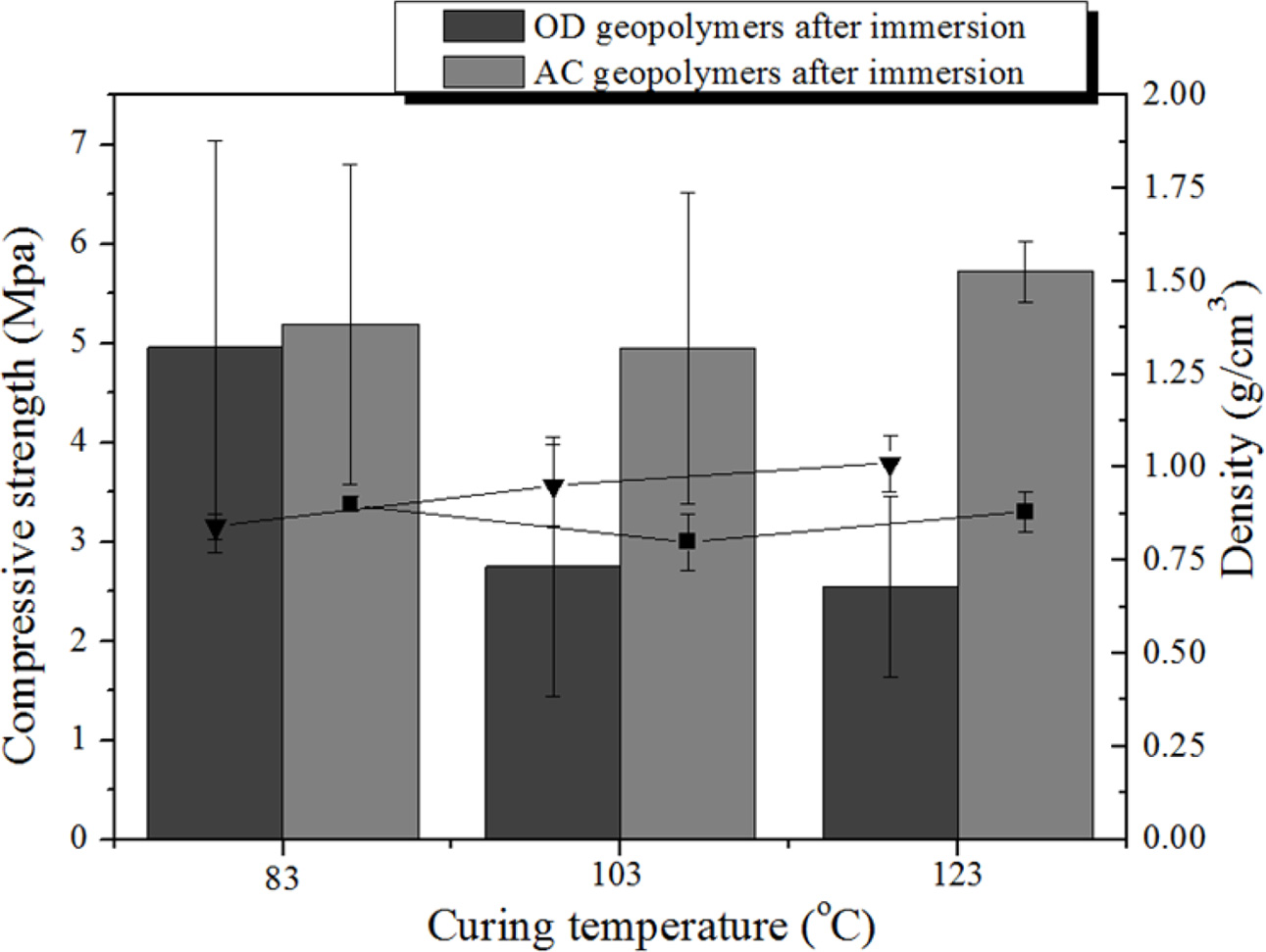 Fig. 6 Comparison of the compressive strength and density of the OD and AC geopolymer specimens obtained at three different curing temperatures after immersion in water for 40 h. |