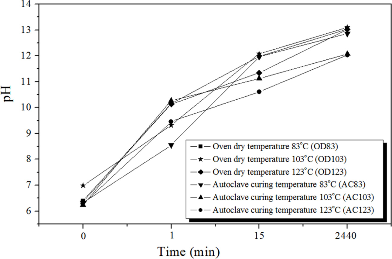 As shown in Fig. 7, the pH values of all OD solutions after immersion for 2440 min were above 13.0; hence, the pH values of the AC103 and AC123 solutions after the same immersion time were 12.08 and 12.03, respectively. The pH difference between the AC and DO solutions was greater than 1.0. This implies that the (AC) specimen cured using an autoclave is more stable in water than that cured with a dry oven even though they did not show the highest compressive strength prior to immersion.