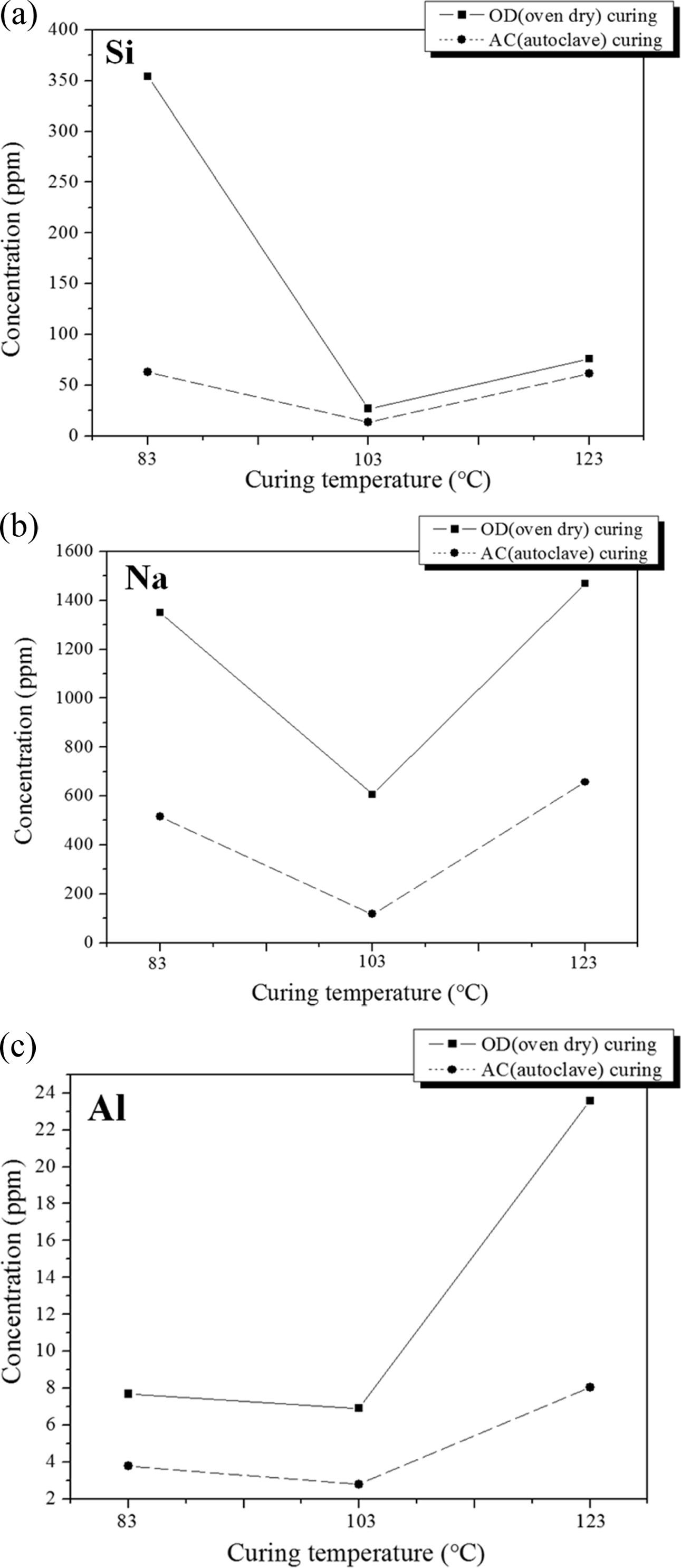 Because the color of the solutions after immersion varied with the curing method, concentrations of three selected ions in the solutions after immersion in distilled water were measured by ICP-AAS (induced coupled plasma- atomic absorption spectroscopy) analysis as shown in Fig. 9. It is observed that the total amount of dissolved ions in the solution after immersion was in the order of Na+, S-2, and Al+3 regardless of the curing temperature and method.