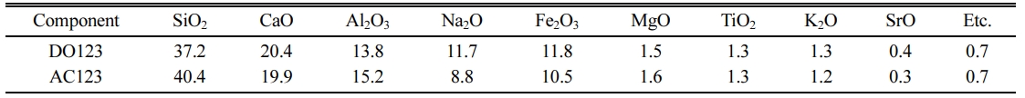 Table 3 shows the XRF result of the specimens cured in the dry oven (DO123) and in the autoclave (AC123) at 123 oC. As shown in Table 3, the contents of both SiO2 and Al2O3 were increased in AC123 specimen as expected from the FT-IR results mentioned above. Because more moisture is provided during the autoclave curing, the extent of polymerization is greater and more O-Si-O and O-Al-O bonds were formed in the AC123 specimen during the aging process.