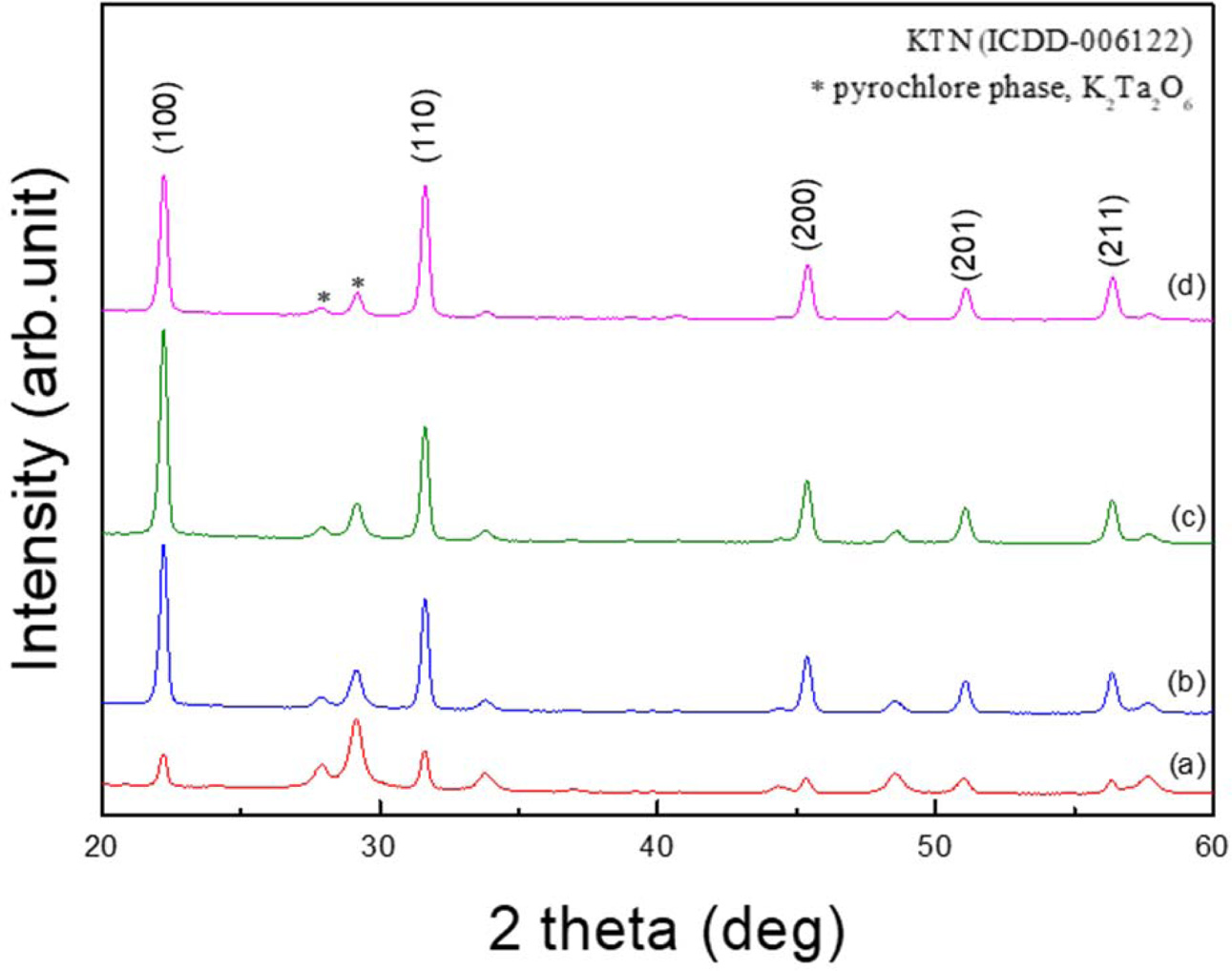 In summary, KTN heterolayered films were fabricated by alternately stacking KTN (30/70) and KTN (70/30) films having cubic and orthorhombic structures, respectively. In the KTN films sintered at 650 oC, the pyrochlore phase was observed as a major phase, however, above 700 oC, the diffraction intensities of the perovskite phase increased significantly and was observed as a major phase. KTN heterolayered thin films showed a polycrystalline crystal structure with no preferred orientation, which is thought to be because the lower KTN films with different crystal structures influenced the crystallization of the upper films during the annealing process. Also, remanent polarization and coercive field for KTN heterolayered thin films are higher than those of single composition KTN (65/35) and KTN (73/27) films. This is thought to be due to the formation of space charge polarization due to the diffusion of ions and lattice mismatch at each interface as the heterolayered structure was fabricated using KTN films with different compositions ratio and crystal structures. In all KTN films, the maximum ΔT values occurred at slightly higher temperature than the Curie temperature. This is believed to be because, at around this temperature, the ferroelectric phase and paraelectric phase coexist, and the dipole is easily switched by the application of the temperature and electric field.