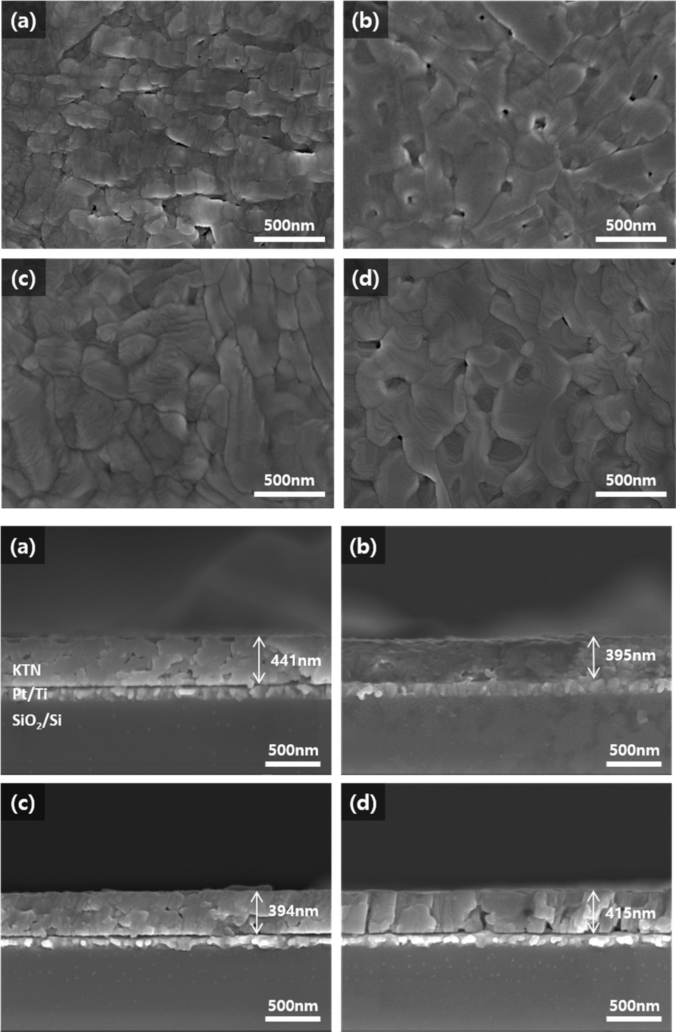 Fig. 2 shows surface and cross-sectional microstructure with variation of sintering temperature of the KTN heterolayered thin film. As the sintering temperature increased from 650 oC to 800 oC, the average grain size increased from 146nm to 380nm, and showed a dense structure. However, in the case of the films sintered at 650 oC and 800 oC, some pores were observed, which is thought to be due to incomplete grain growth due to the low sintering temperature and volatilization of K-ions due to excessive sintering temperature, respectively. Average thickness of KTN films was about 394-441 nm and showed a uniform and flat cross-sectional structure. Interface between KTN (30/70) films and KTN (70/30) films could not be observed, which is believed to be due to the small heterogeneity between the interfaces due to the same crystalline structure and same K, Nb, Ta constituent elements.