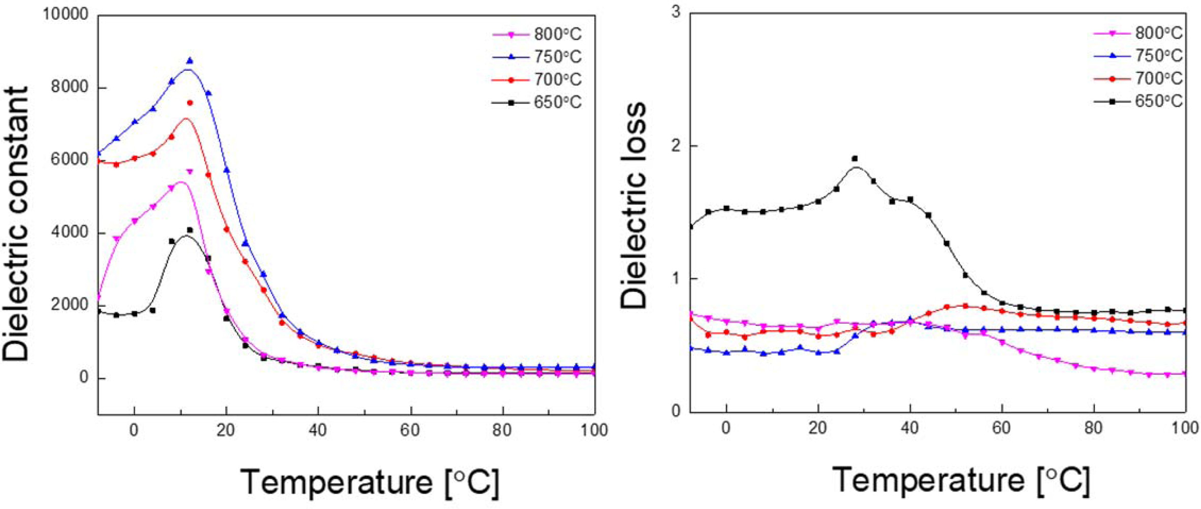 Fig. 3 shows relative dielectric constant and dielectric loss with variation of temperature of KTN heterolayered films. Dielectric constant increased with increasing the sintering temperature, showing the highest value in the film sintered at 750 oC before decreasing at 800 oC. This is because the pyrochlore phase and pores decreased, and the ferroelectric grain size increased with the increase in sintering temperature, as observed in Fig. 1 and 2. Curie temperatures of KTN (30/70) and KTN (70/30) materials are 230 oC and –25 oC, respectively [11]. However, KTN heterolayered films fabricated in our study exhibited a phase transition temperature of about 12-13 oC. This is because thin films with different structural and electrical properties are repeatedly stacked together, so that the lower layer affects the crystallization of the upper layer when the specimen is sintered. It is believed to be due to the formation of the interfacial layers due to the diffusion of Ta and Nb ions [12]. KTN films sintered at 650 oC exhibited high dielectric loss due to the distribution of the pyrochlore phase and the formation of an incomplete crystal phase. Dielectric constant and dielectric loss at room temperature of the KTN films sintered at 750 oC were about 2,850 and 0.573, respectively.