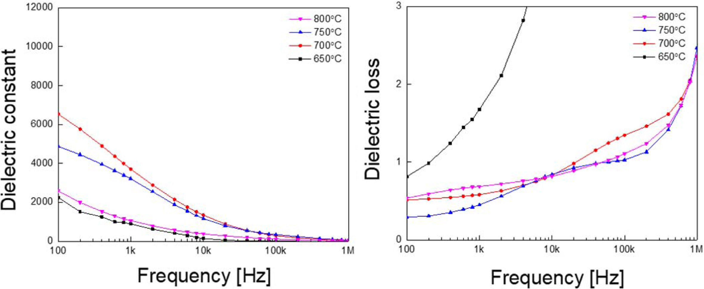Fig. 4 shows dielectric constant and dielectric loss according to the frequency of KTN heterolayered films. All KTN films exhibited typical dielectric relaxation characteristics in which the dielectric constant decreases as the frequency increases, and, the dielectric constant decreased significantly in the high frequency region. This is thought to be due to the formation of space charge polarization due to the diffusion of ions and lattice mismatch at each interface as the heterolayered structure was fabricated using KTN films with different compositions ratio and crystal structures [12].