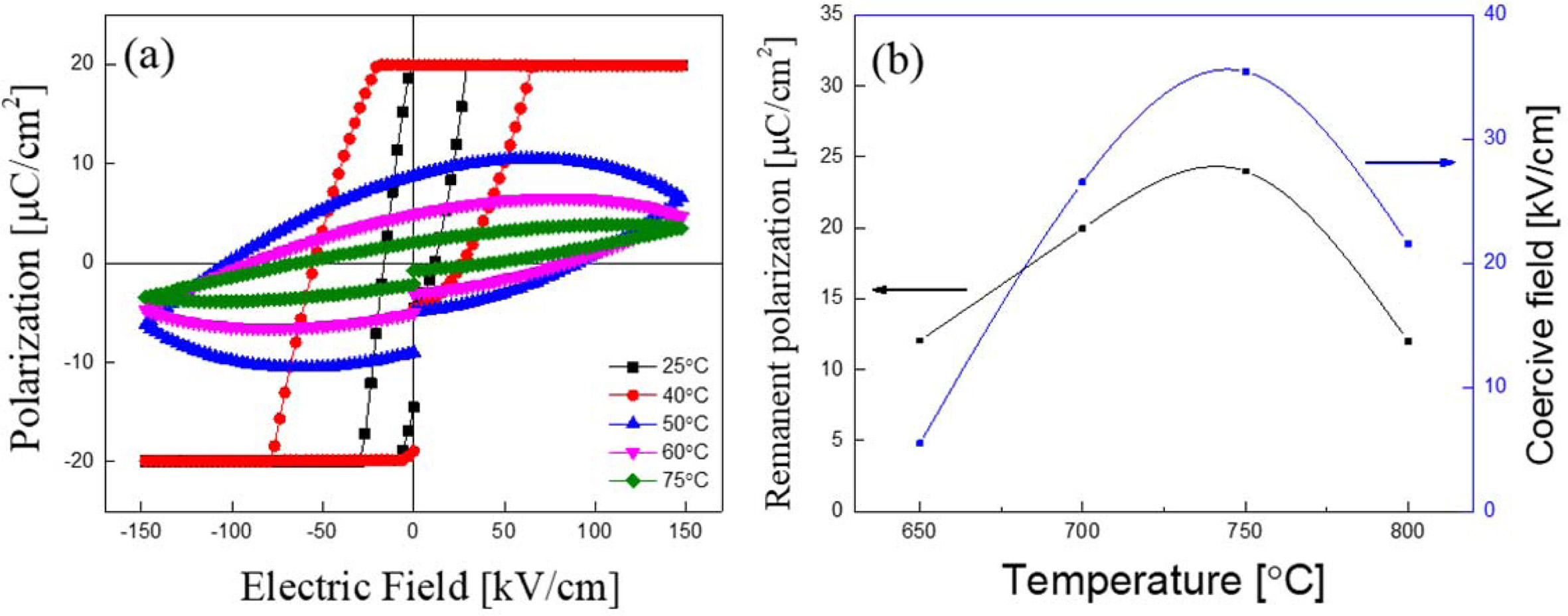 Fig. 5 (a) P-E hysteresis loop and (b) Remanent polarization and coercive field with a variation of the sintering temperatures of KTN heterolayered film sintered at 700 oC. |