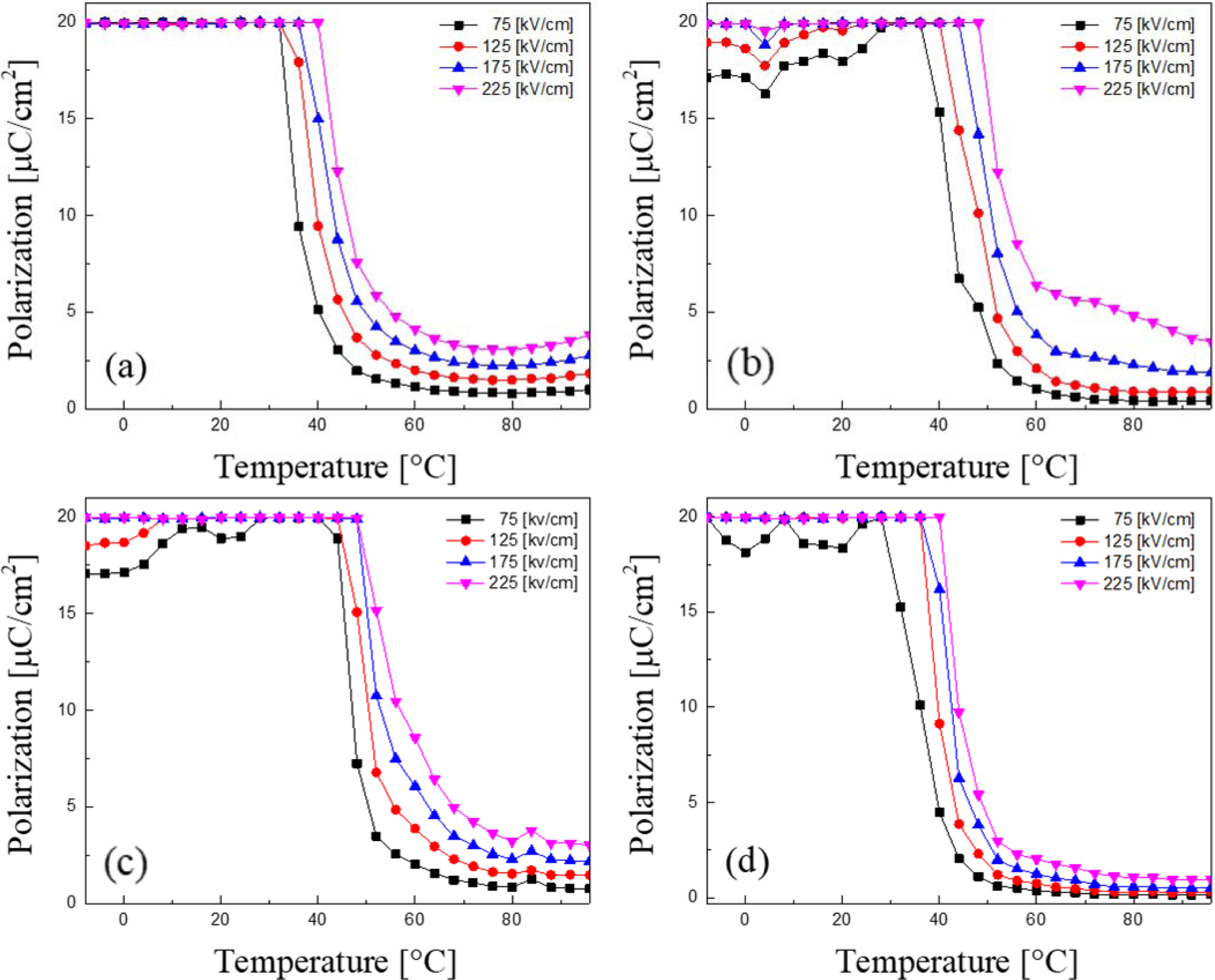 Fig. 6 shows remanent polarization of the KTN heterolayered films according to the temperature and applied electric field. As the applied electric field increases, the temperature at which the polarization decreases moved higher, which is believed to be because the applied DC electric field inhibits the switching of dipoles and induces the forced polarization arrangement. Under an electric field of 225 kV/cm, the temperature at which the polarization begins to decrease rapidly is about 40 oC in KTN films sintered at 650 oC and 800 oC, and at about 47 oC in KTN films sintered at 700 oC and 750 oC. As discussed in the structural characteristics, KTN films sintered at 650 oC and 800 oC exhibited a property of decreasing polarization at low temperatures because the formation of depolarizing field due to the pyrochlore phase and pores.