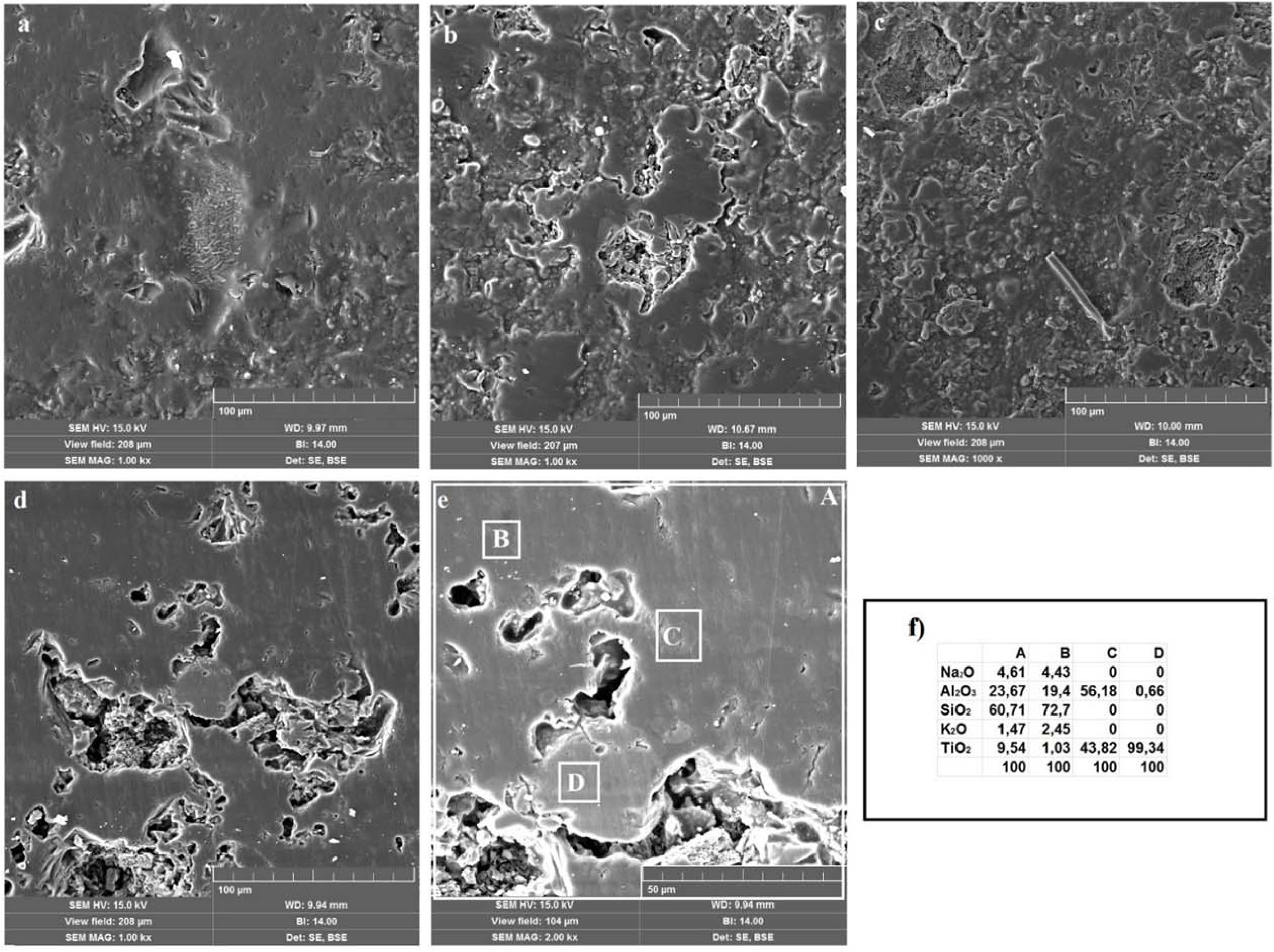Fig. 1 SEM images of (a) Porcelain (P), (b) Porcelain- aluminium titanate (PAT), (c) Porcelain - Mullite (PM) and (d) Porcelain – Aluminium titanate - mullite (PMAT) ceramic composites obtained. Samples were sintered at 1,200 oC for 5 h. (e) PMAT ceramic sample at 2000× (f) Representative result of EDX analyses performed on the PMAT sample sintered at 1,200 oC for 5 h. |
