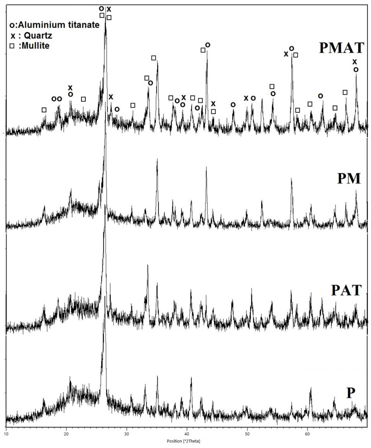 Fig. 2 XRD patterns: Porcelain (P), Porcelain - aluminium titanate (PAT), Porcelain - Mullite (PM) and Porcelain – Aluminium titanate - mullite (PMAT) ceramic composites after sintering at 1,200 oC for 5 h. |