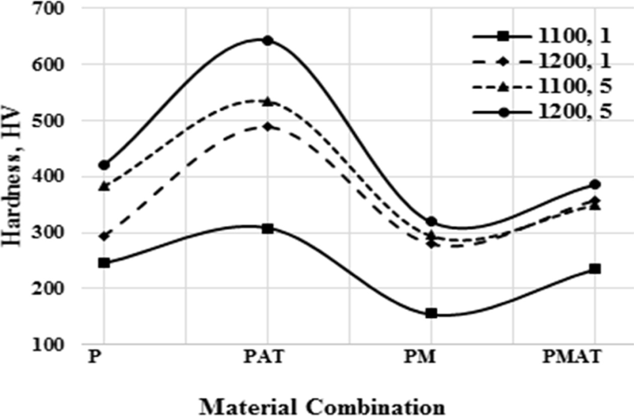 6. As the temperature and sintering time increased, the hardness of the all samples increased. In the hardness measurements, increased sintering temperature and time increased with the addition of AT added porcelain, while there was some decrease in the porcelain with M addition.