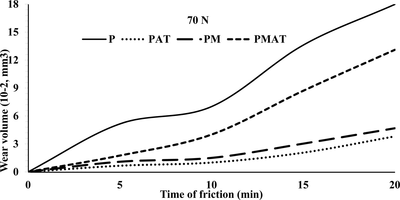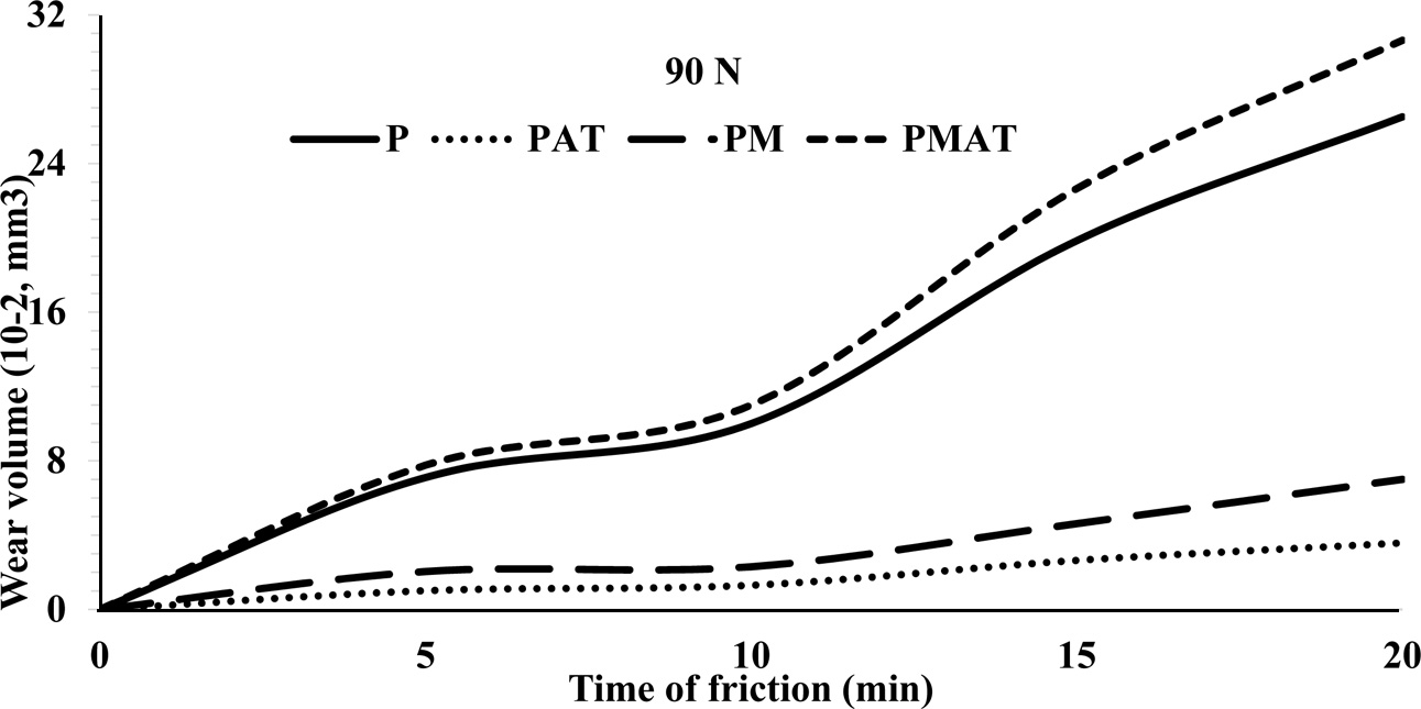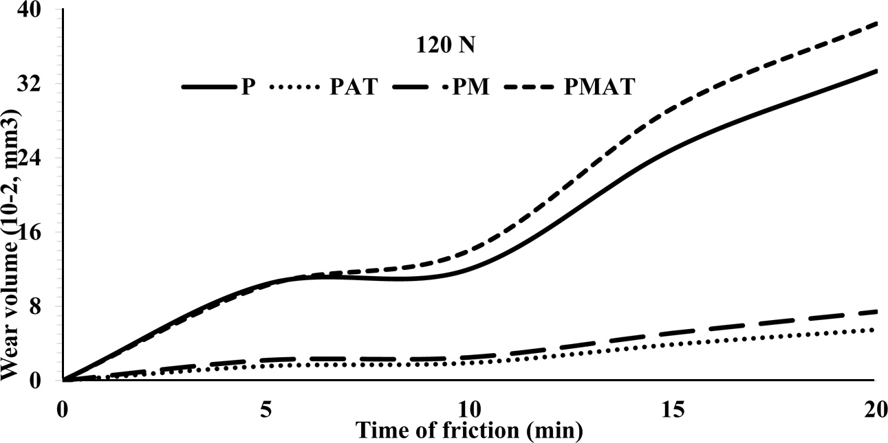 As the load and time increased in all samples, the amount of wear increased. Zhang et al. concluded that the specific wear rate of B4C-SiC ceramics increased with the increase in load [31]. Similarly, Akkus et al. found that the wear rate increased with increasing wear load and load application time. [20]. The wear volume in the P specimen under 70 N load for 5 min was 5.15 x 10-2 mm3 while it reached 33.33 x 10-2 mm3 at 20 min under 120 N load. The wear volume in the PAT specimen under 70 N load for 5 min was 0.66 x 10-2 mm3 while it reached 5.48 x 10-2 mm3 at 20 min under 120 N load. The wear volume in the PM specimen under 70 N load for 5 min was 1.09 x 10-2 mm3 while it reached 7,41 x 10-2 mm3 at 20 minutes under 120 N load. The wear volume in the PMAT specimen under 70 N load for 5 min was 1,75 x 10-2 mm3 while it reached 38,44 x 10-2 mm3 at 20 min under 120 N load. While M and AT additive improved the wear characteristics of porcelain, P and AT had negative effects on two-in-one wear [20-22].