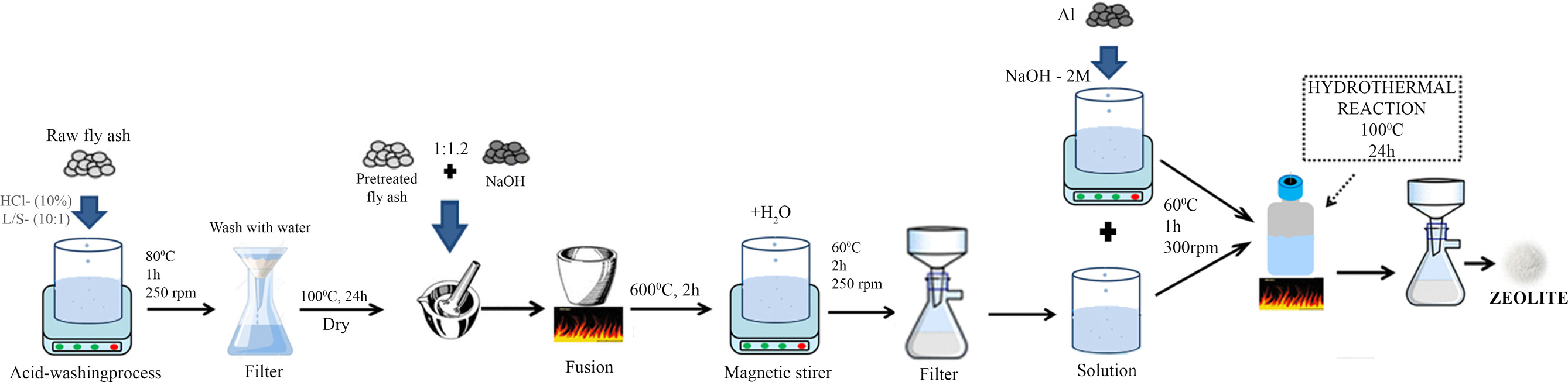 The raw fly ash was pretreated by acid-washing to remove the calcium and iron using a 10% HCl solution in the mass ratio of 10:1 liquid: solid. The mixture was magnetically stirred at 80 oC for 1 h at 250 rpm. The fly ash was then filtered and washed with distilled water repeatedly and dried at 100 oC for 24 h.
