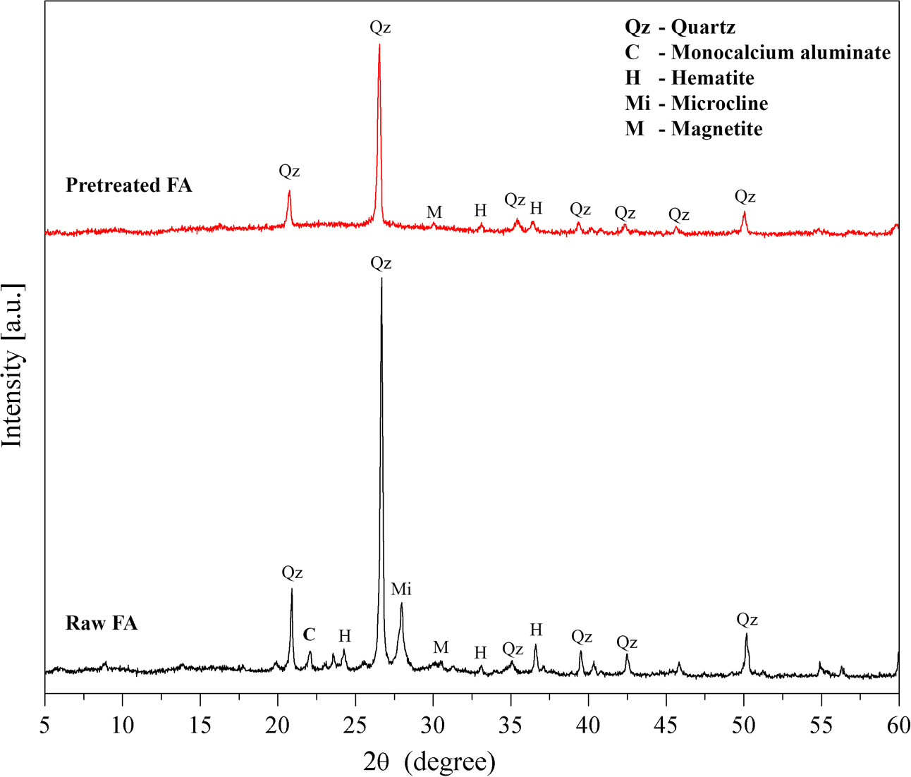 The XRD pattern of fly ash (Fig. 2) shows the major crystalline phase to be quartz (SiO2), small amounts of microcline (KAlSi3O8), hematite (Fe2O3), magnetite (Fe3O4) and monocalcium aluminate (CaAl2O4).