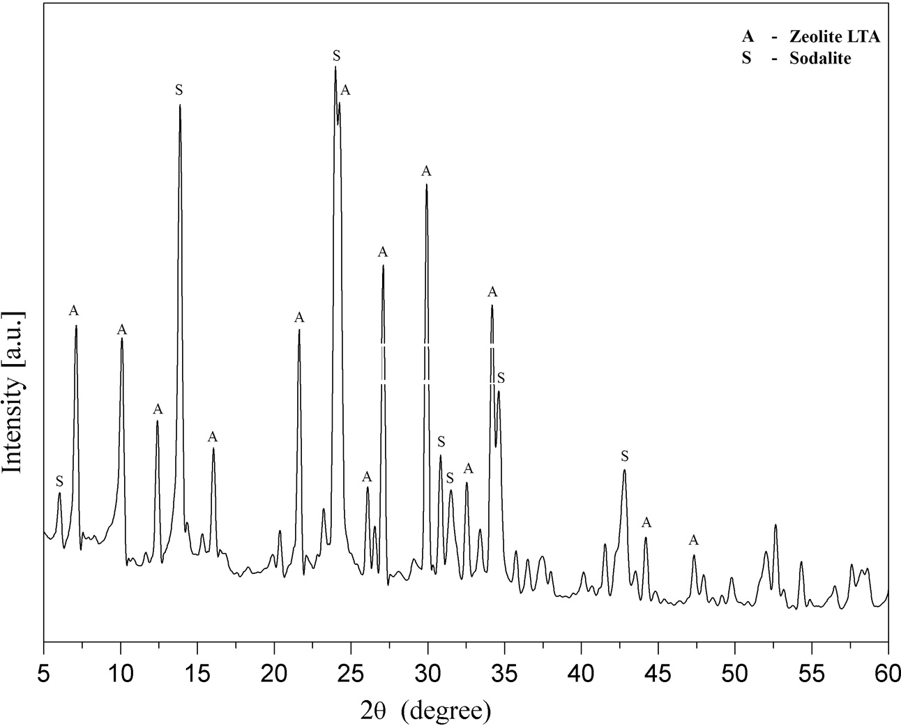 Fig. 3 shows the XRD pattern of synthesized zeolite. The zeolite A (Na-A) and small amounts of sodalite were assigned as the major and minor crystalline phases in the synthesized zeolite. In contrast to previous research on unwashed fly ash [11], relatively pure zeolite A with a small amount of sodalite was made from the high calcium and iron-containing fly ash. The presence of sodalite likely to be resulted by crystallization of it within zeolite A core due to increased pressure, as it described by [31]. Therefore, optimization of the zeolite synthesizing condition, possibly by reducing the crystallization time and temperature may decrease the content of the sodalite, though, a transformation of an initially formed sodalite into zeolite NaP has been observed [32].