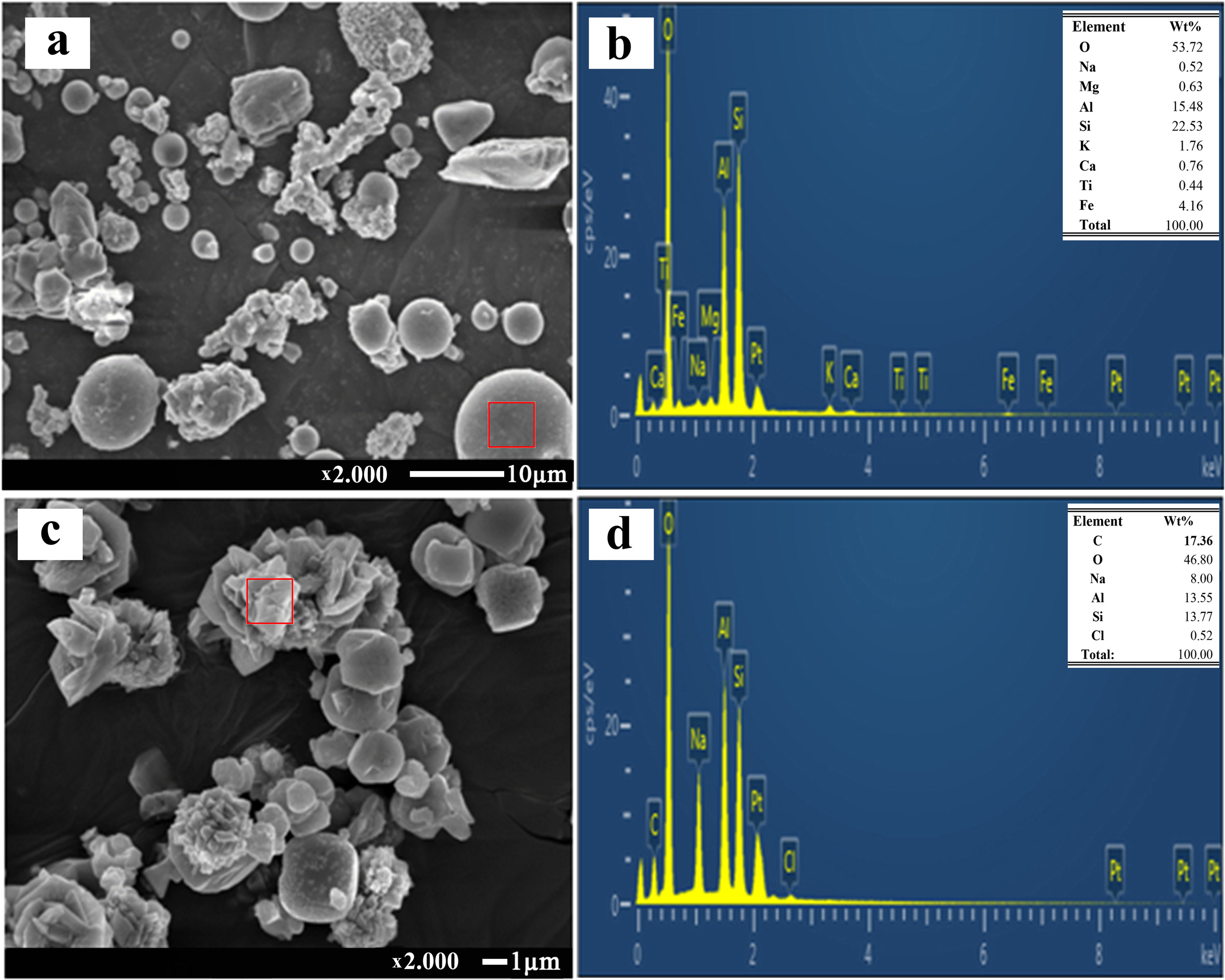 Fig. 4 shows the SEM micrographs and corresponding EDS spectra of the acid-washed fly ash and synthesized zeolite. Fig. 4(a) shows the acid-washed fly ash is composed predominantly of polydisperse spheres with smooth surfaces, while the EDS data (Fig. 4(b)) of an ash sphere shows it to be an iron aluminosilicate glass.