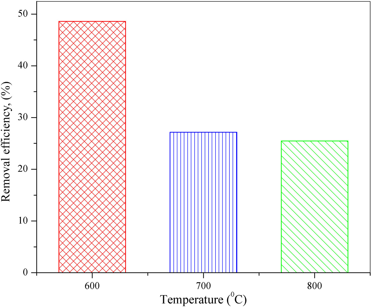 The results in Fig. 5 show that the most suitable fusion temperature is 600 oC. With the increase in temperature from 600 to 800 oC, the ammonium removal efficiency decreased from 48.5% to 15.9%. Our findings in good agreement with previous results reported that the increase of zeolite yield was observed from temperatures above the melting point of NaOH (318 oC) to a maximum crystallinity at 600 oC [34]. With the increased fusion temperature, the synthesized zeolite crystallinity decreases due to glass phase formation. Our preliminary study showed that an alkali fusion temperature of 500 oC was not sufficient for complete reaction. The CEC of the zeolite prepared at 500 oC was too low to consider further study.