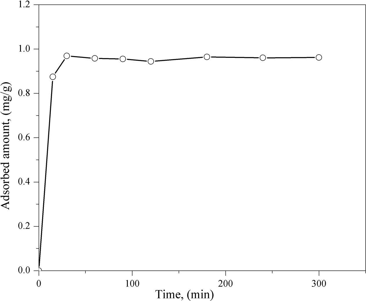The effect of time on Cr (III) sorption onto the synthetic zeolite is shown in Fig. 6. Fig. 6 shows the amount of Cr (III) adsorbed increased dramatically within the first 30 min, at which time 0.969 mg/g was adsorbed, representing almost complete removal of Cr (III). This figure indicates that adsorption was very rapid, with equilibrium achieved within 60 min.