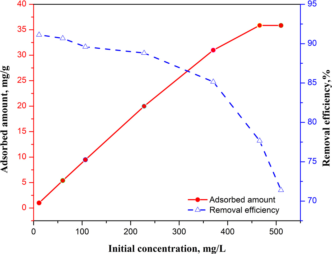 Fig. 8 Effect of initial Cr (III) concentration on the chromium removal efficiency and removal capacity by the synthesized zeolite (adsorbent dosage = 0.5 g; pH = 4.1; room temperature) |