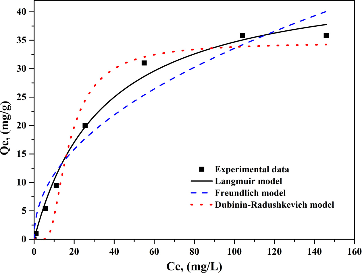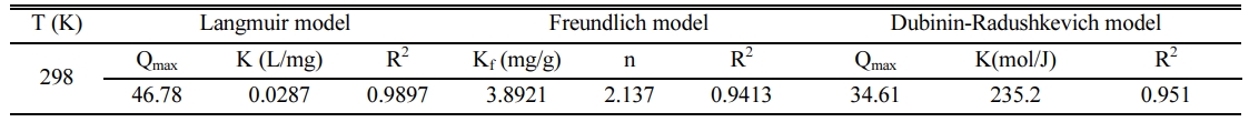 The adsorption data were analyzed in terms of the Langmuir isotherm, Freundlich and Dubinin-Raduskhevich (D-R) isothermal models as they are the most commonly used isotherms to describe solid-liquid adsorption systems [38].