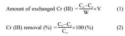 where Co and Ce are the initial and equilibrium Cr (III) concentrations of the test solution (mg/L), (V) is the test solution at volume (L), and W is the amount of adsorbent (g).