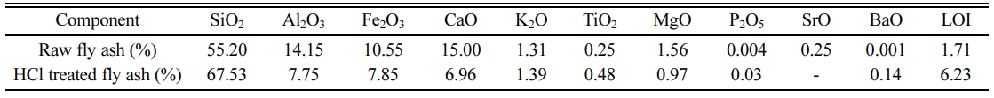 A fly ash sample obtained from the 4th thermal power plant in Ulaanbaatar, Mongolia, was passed through a 100-mesh sieve before use. The chemical compositions of the raw and acid-washed fly ashes, determined by X-ray fluorescence (Rigaku, Primini), are listed in Table 1. The average particle size (Shimadzu, SALD-2100) of the fly ash was 27.91 µm, and the BET specific surface area calculated from N2 isotherms (Belsorp, mini) was 2.75 m2/g.