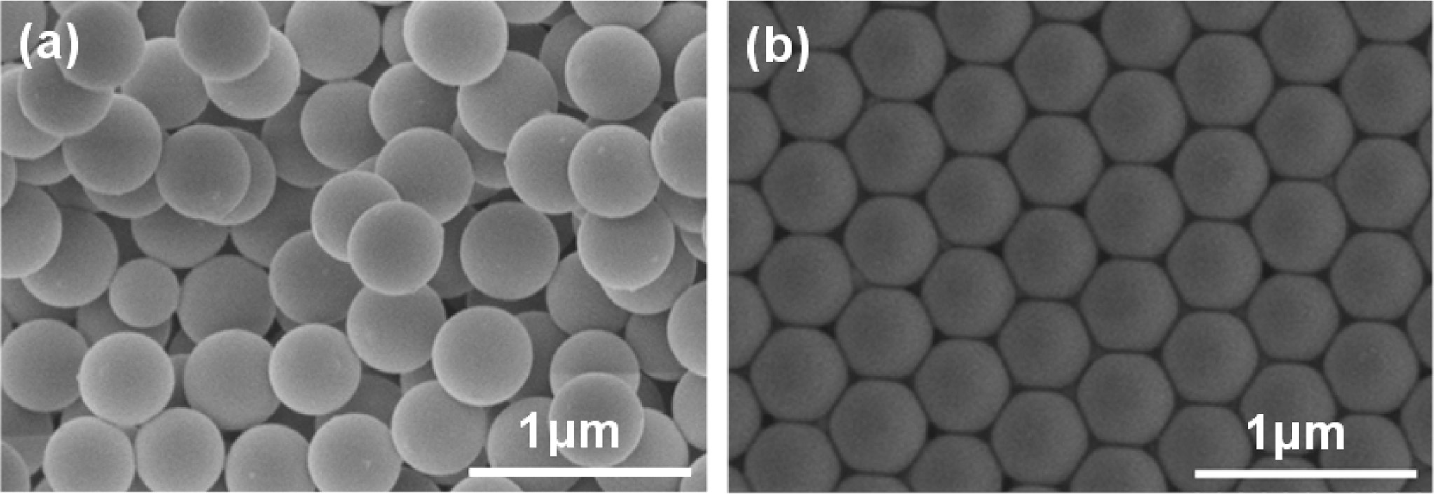 Fig. 1 shows the SEM images of PS microspheres and PS colloidal crystal templates. PS microspheres had regular spherical shape, good monodispersity and the crystal template was arranged periodically.