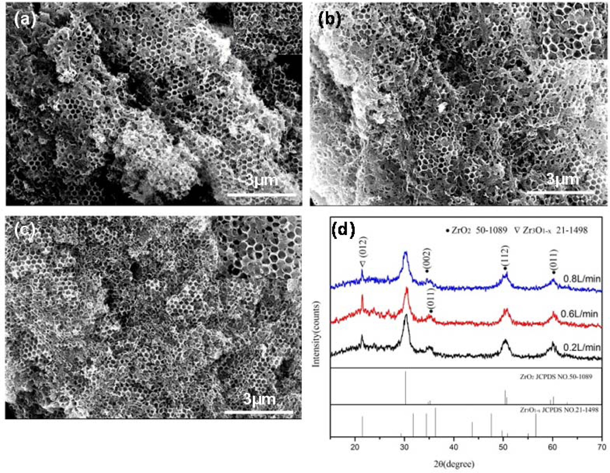 Fig. 2 shows SEM images of the inverse opal zirconia sintered at 450 oC with various nitrogen flow rate. With increasing of the nitrogen flow from 0.2 L/min to 0.8 L/min, the morphology of the inverse opal zirconia did not change significantly as shown in Fig. 2(a-c), suggesting that nitrogen flow did not have a considerable influence on the morphology, while the crystallinity of the inverse opal zirconia became worse (Fig. 2(d)). When the nitrogen flow rate was increased from 0.2 L/min to 0.6 L/min, the main cubic phase peak decreased significantly, while the hexagonal Zr3O1-X diffraction peak on the (0 1 2) crystal plane increased. It indicated that with increasing of the nitrogen flow rate, the oxygen content in the furnace decreased and the Zr /O atomic ratio increased, which led to the increase of reaction temperature of zirconium acetate decomposition to zirconia. Therefore, the crystallinity of zirconia decreased while the anoxic phase Zr3O1-X increased. When the nitrogen flow rate was increased from 0.6 L/min to 0.8 L/min, the characteristic peak of the primary crystal orientation decreased slightly and the hexagonal Zr3O1-X diffraction peak also reduced, indicating that nitrogen as a protective atmosphere reduced the crystallinity of the inverse opal zirconia.